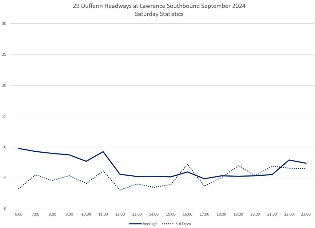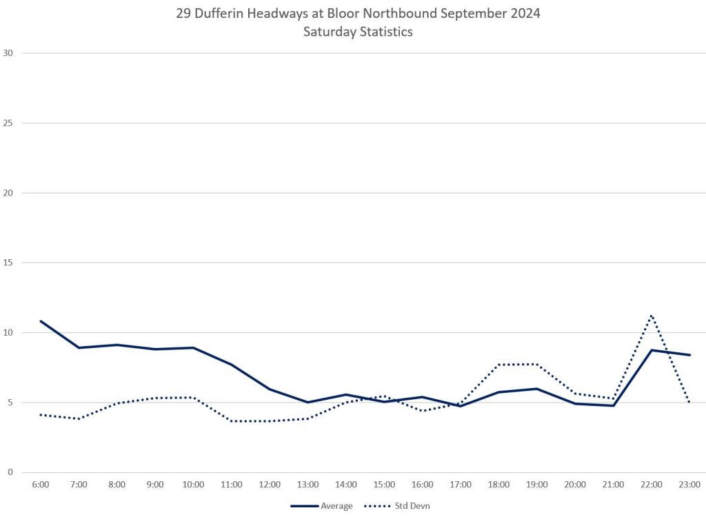 The same data are presented below as averages and standard deviations. The latter show the the degree of scatter of values around the average. Those averages sit at roughly the 8 minute mark which is the scheduled headway on 29 Dufferin for most of the day. However, the SD values are in the 4-6 minute range indicating that about two-thirds of the data lies 8-12 minutes either side of the average. For regular service, it is impossible to achieve an SD of zero because transit service does not run precisely on time, but a lower value would indicate less variation in gaps that riders see.