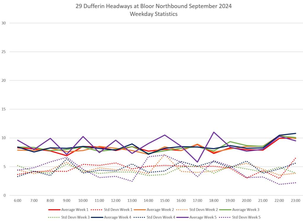 Note that “week 5” here (purple) contains only one day, Monday, September 30, and this was a particularly bad day with severe congestion from noon onward at the north end of the route. Values for the other weeks contain at least four days (“week 1” contains Labour Day which is not included). Despite the wide range of headways shown on the charts above, the average values below lie close to the 8 minute schedule headway. This could erroneously be interpreted to mean that the service was behaving well, when in fact all that this tells us is that all of the scheduled buses showed up, not whether they were well-spaced.
