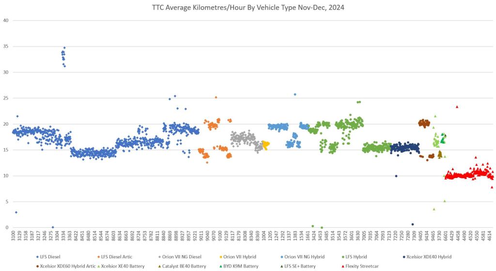 The chart below shows the distance travelled by each vehicle. The values partly reflect different utilization rates, and partly the average speed of routes served by each garage. Streetcars are affected by the lower operating speed within their territory, and the battery buses by a combination of low service hours and the nature of routes to which they are assigned. There are a few buses with high mileages in the LFS Diesel group. These are the buses assigned to the Airport Express. (They also show up as outliers in the average speed chart below.)