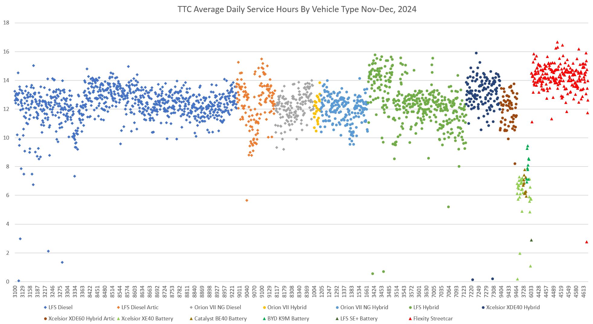 A key issue here is the timely delivery and reliability of the new battery bus fleet. These are intended to replace older hybrid and diesel buses, and their availability will affect the TTC’s ability to field service. Also unknown at this time is the overhead in vehicle requirements and service to allow for recharging vehicles. The effective replacement ratio with battery buses is not yet known.