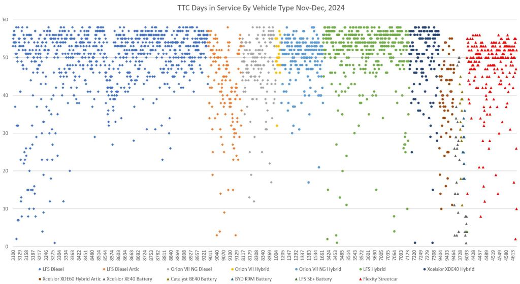 Steve: Yes, I know there are gaps from retirements and other various reasons. My main purpose is to illustrate how many vehicles were active over November-December 2024, and their typical operating conditions. I will fix the table to distinguish between the two number ranges. Thanks for catching this.