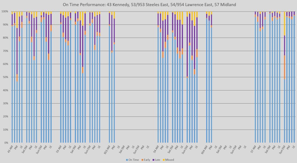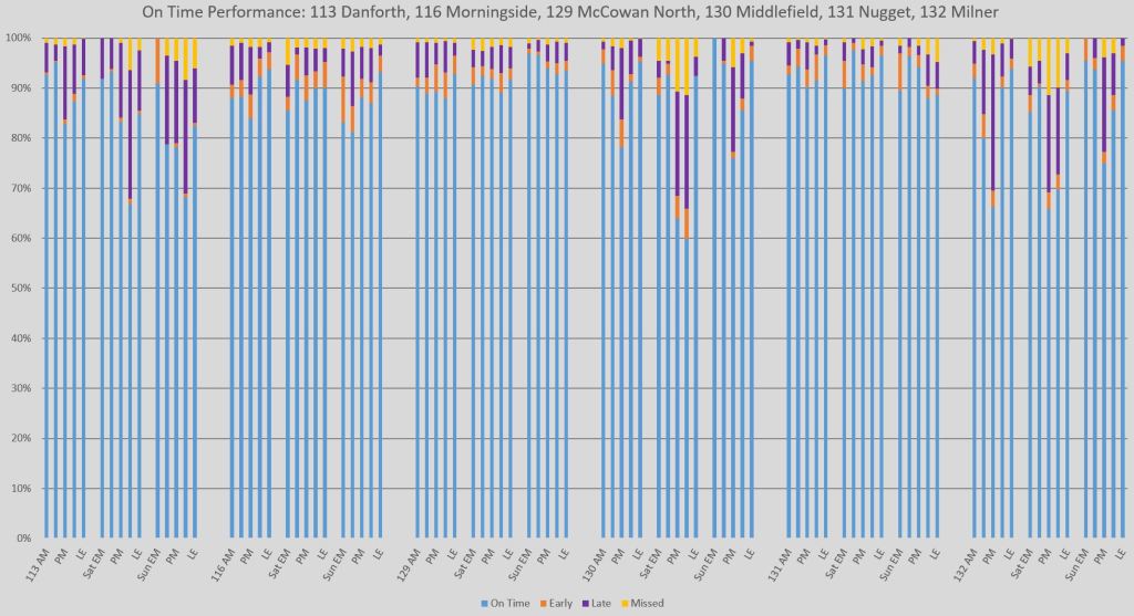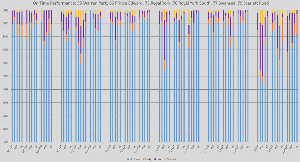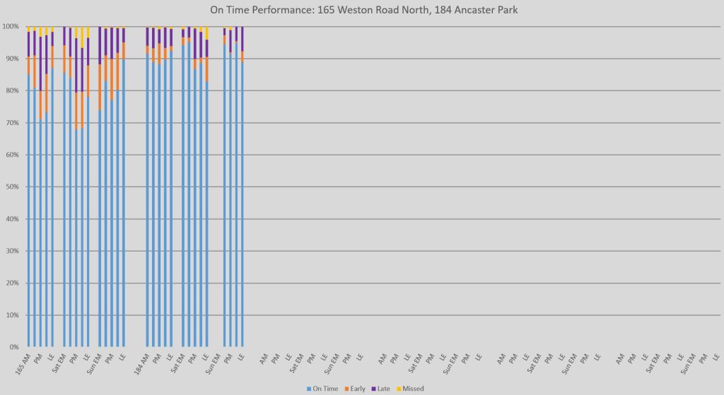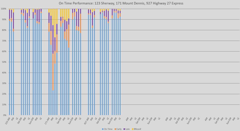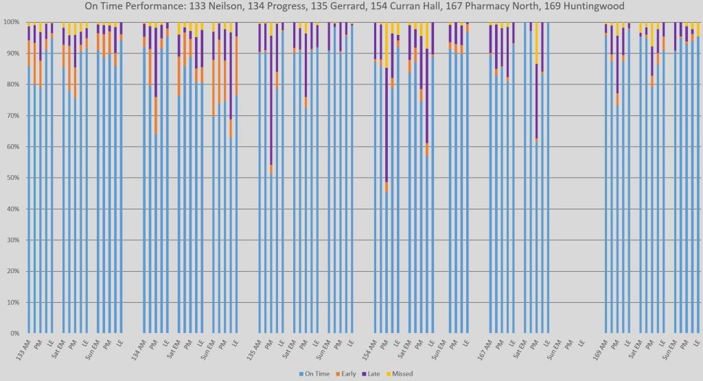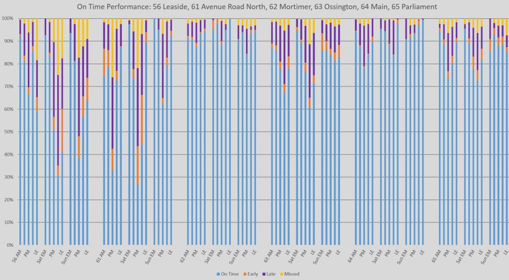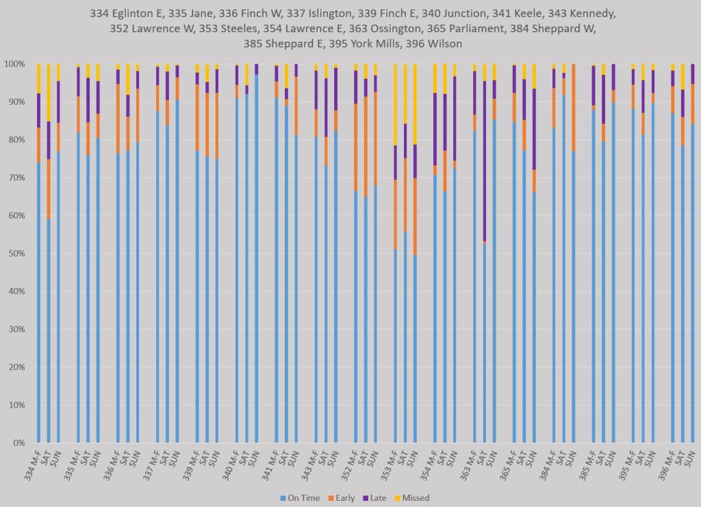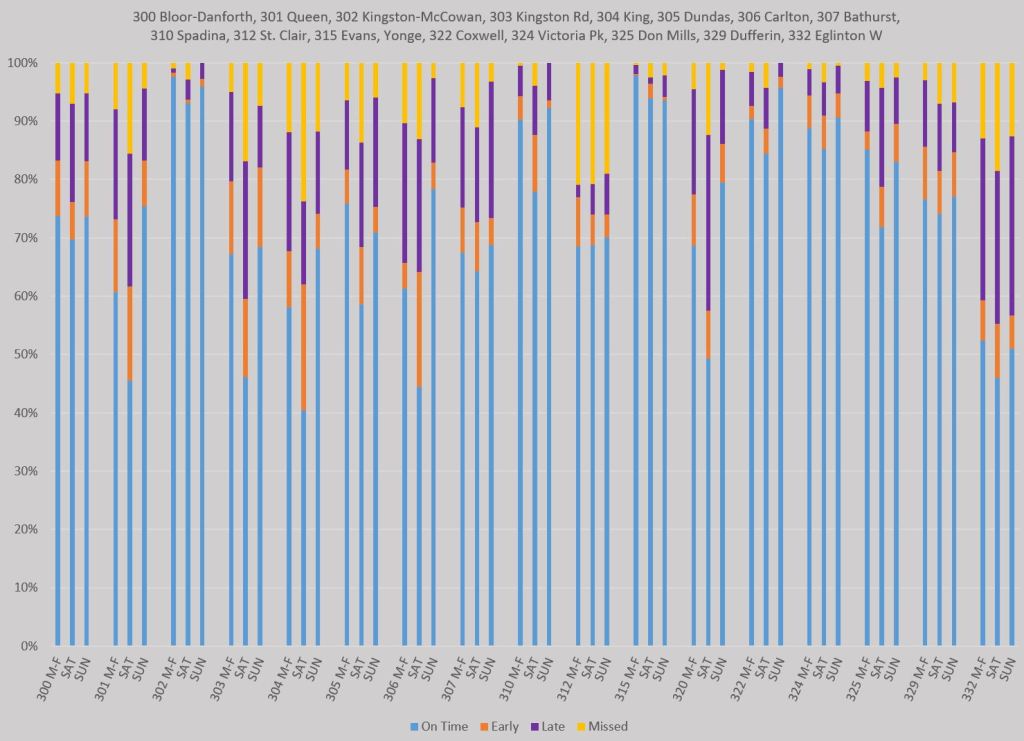 The yellow bars (night service) only appear on the rightmost of the six columns because that is when 300-series routes are in service. About 20% of the service is late or early, and on Saturdays [actually Sunday morning] about 10% of service is missing at terminals. Reliability is quite poor on a service riders depend on for safe travel to and from shift work.