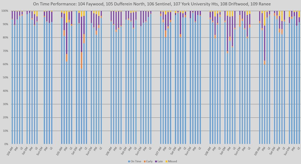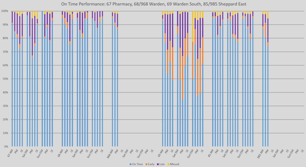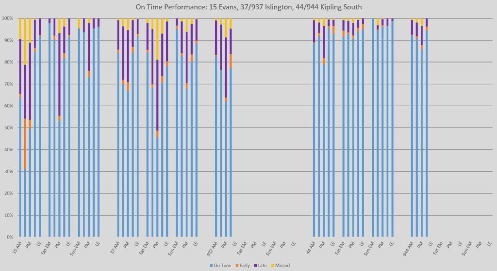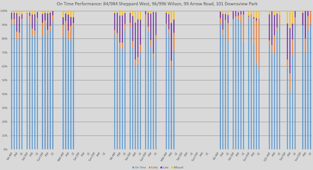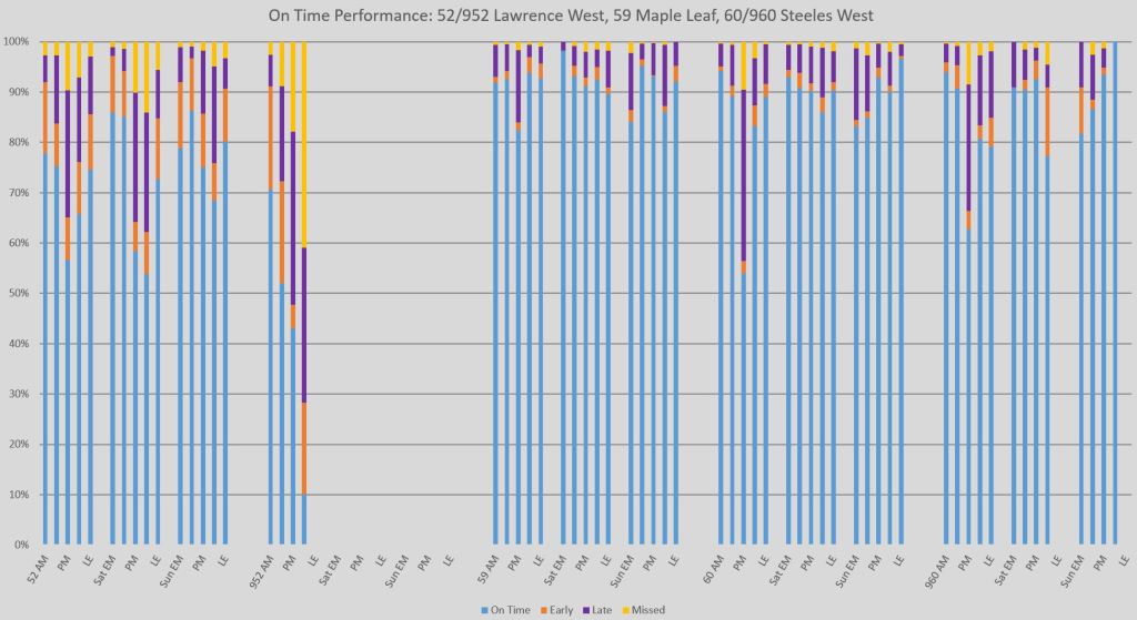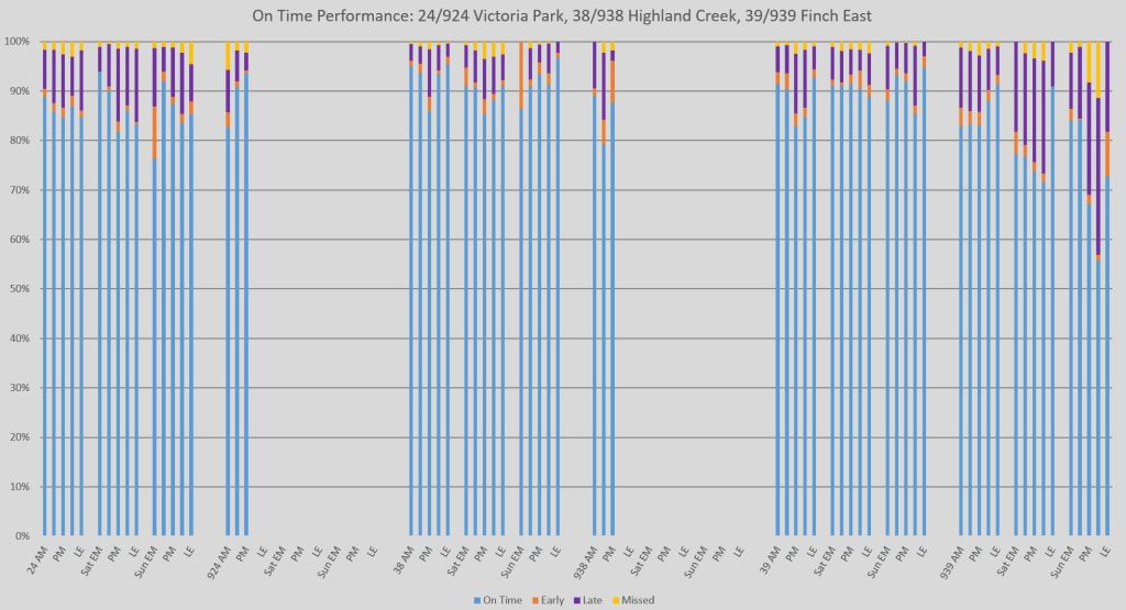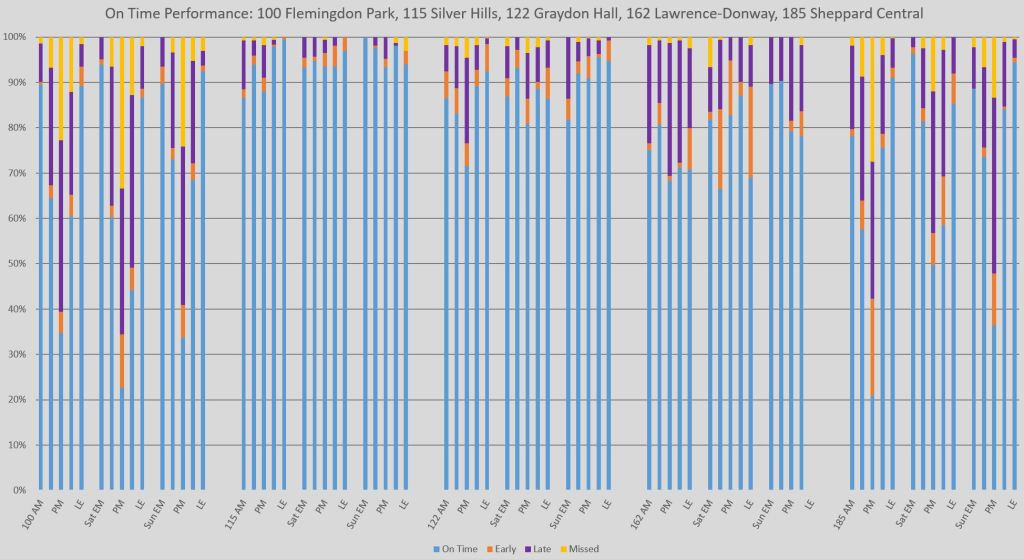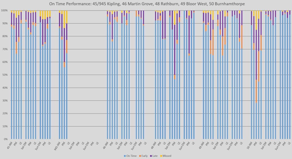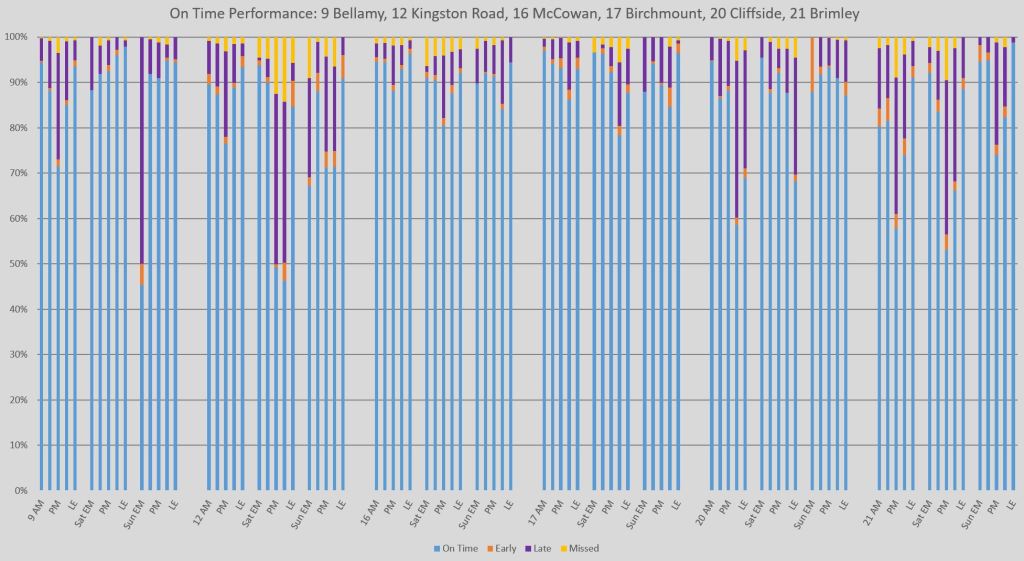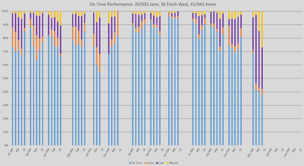 The yellow bars (night service) only appear on the rightmost of the six columns because that is when 300-series routes are in service. About 20% of the service is late or early, and on Saturdays [actually Sunday morning] about 10% of service is missing at terminals. Reliability is quite poor on a service riders depend on for safe travel to and from shift work.