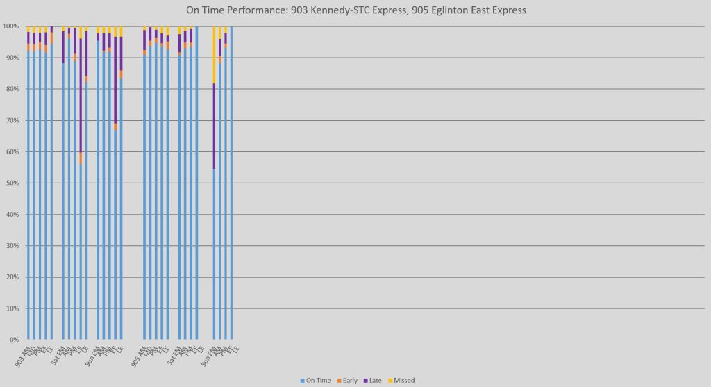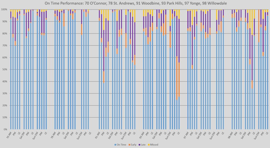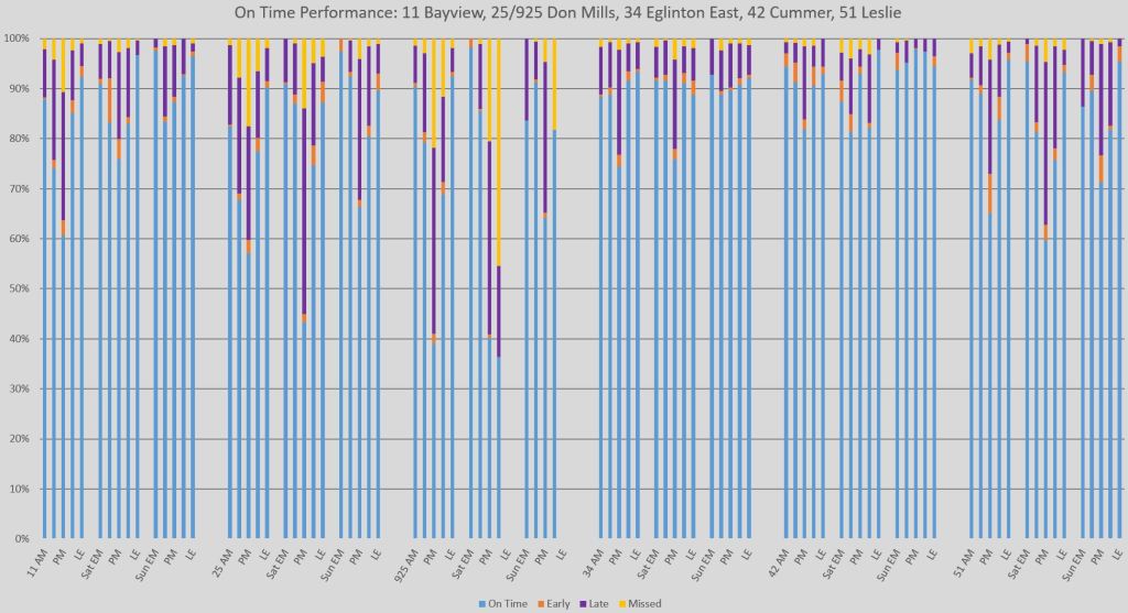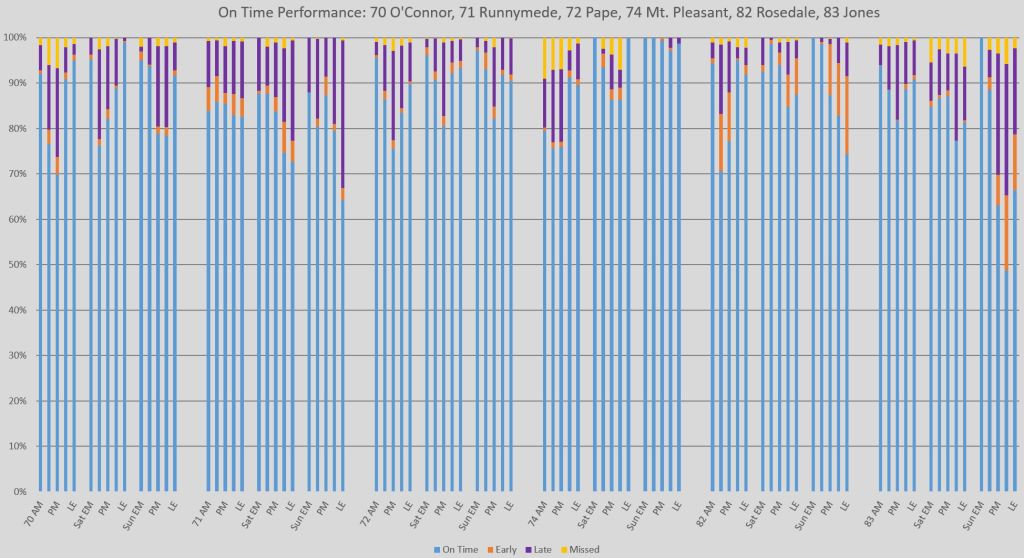 First, here is a breakdown by mode. The roughly echoes the values reported by the TTC with bus service achieving just over 80% “on time” trips and streetcars about 70%. Broken out here are the Express Bus routes (900 series) and the Blue Night routes (300 series). Note that night services which should have no problems with traffic congestion do not fare well.