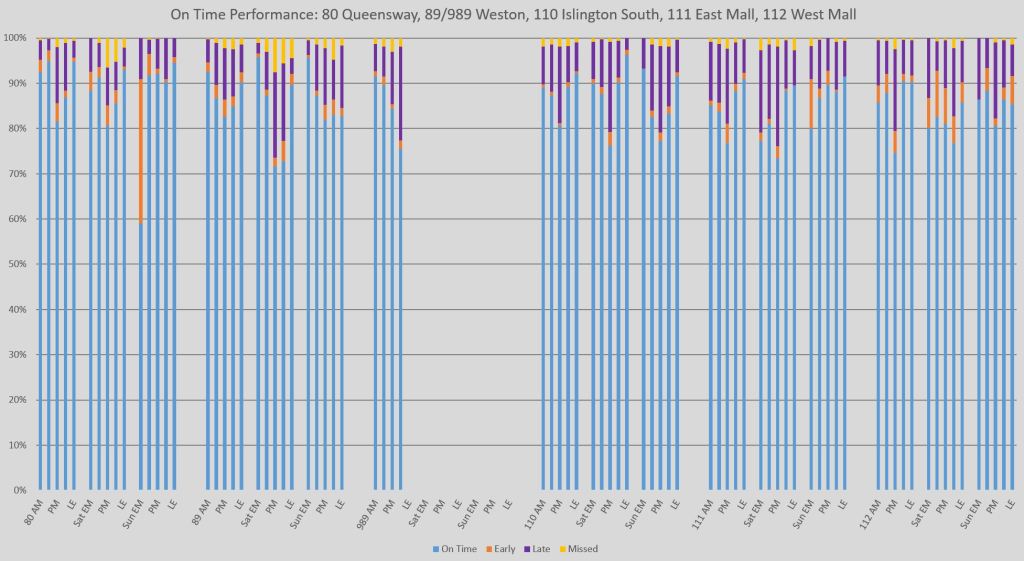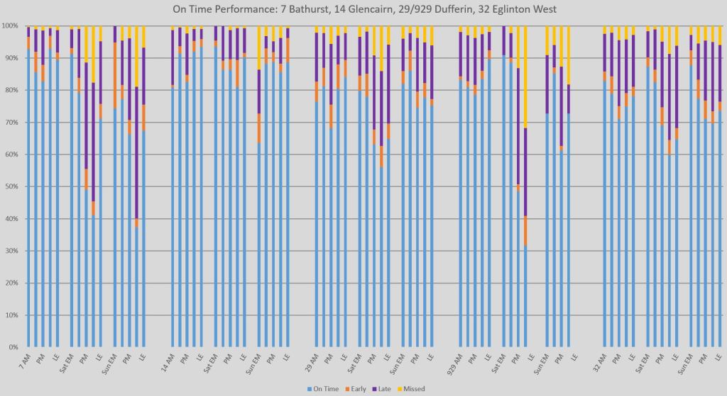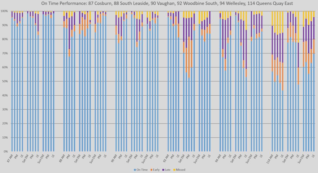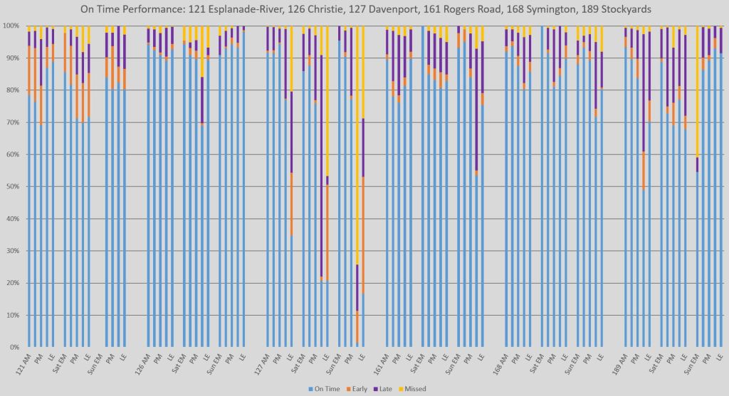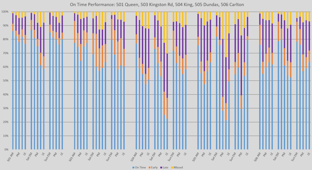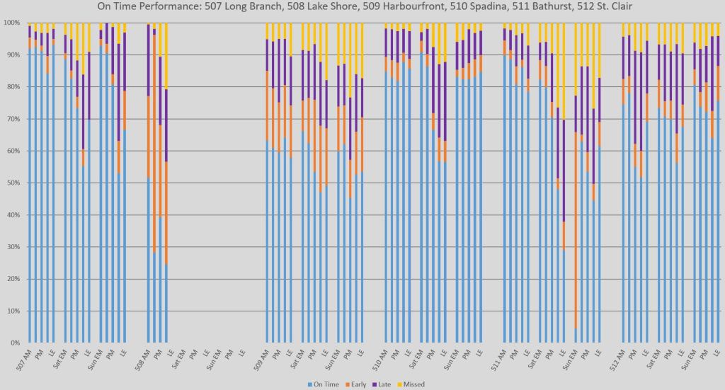 504 King and 505 Dundas have particularly bad performance on Saturdays. The 507 Long Branch car performs quite well on weekdays, but weekends are quite another matter.