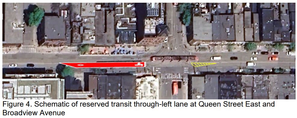 As part of this plan, a reserved lane will be created for streetcars eastbound approaching Broadview on Queen, and left turns by other traffic will be banned there.