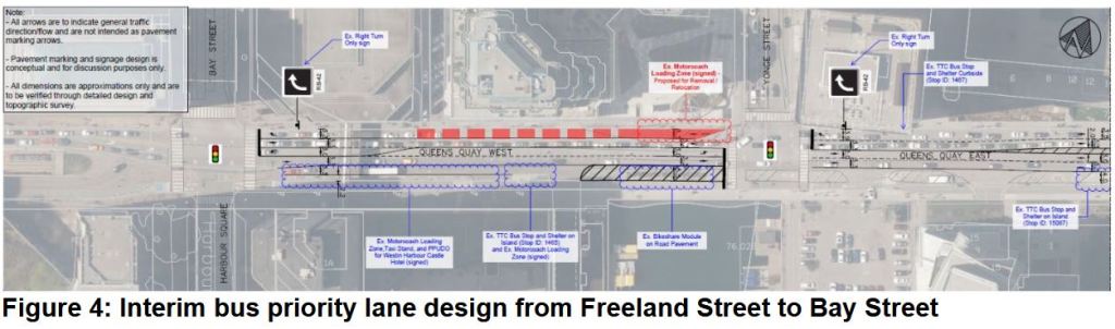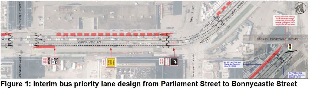 In the long wait for any kind of transit improvement for the eastern waterfront, the City of Toronto and TTC now plan to install reserved bus lanes on Queens Quay between Bay and Parliament Streets. A short stretch is also proposed for Front Street between Bay and Yonge Streets eastbound.