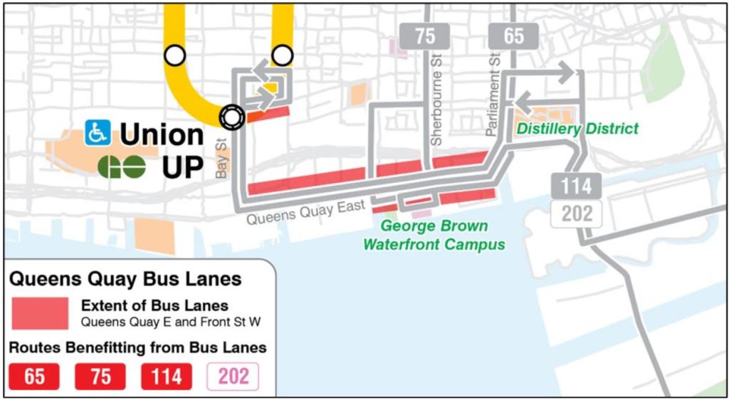 The area is now served, albeit infrequently, by a mix of routes that can often be snarled in traffic. The intent is to save up to five minutes travel time between Bay and Parliament. The reserved lanes will also host future improved service to developments on the eastern waterfront pending construction of the planned, but long-delayed Waterfront East LRT.