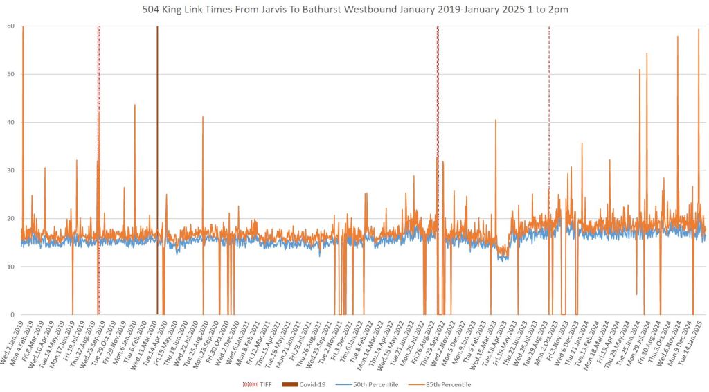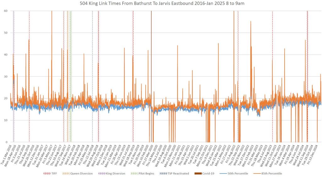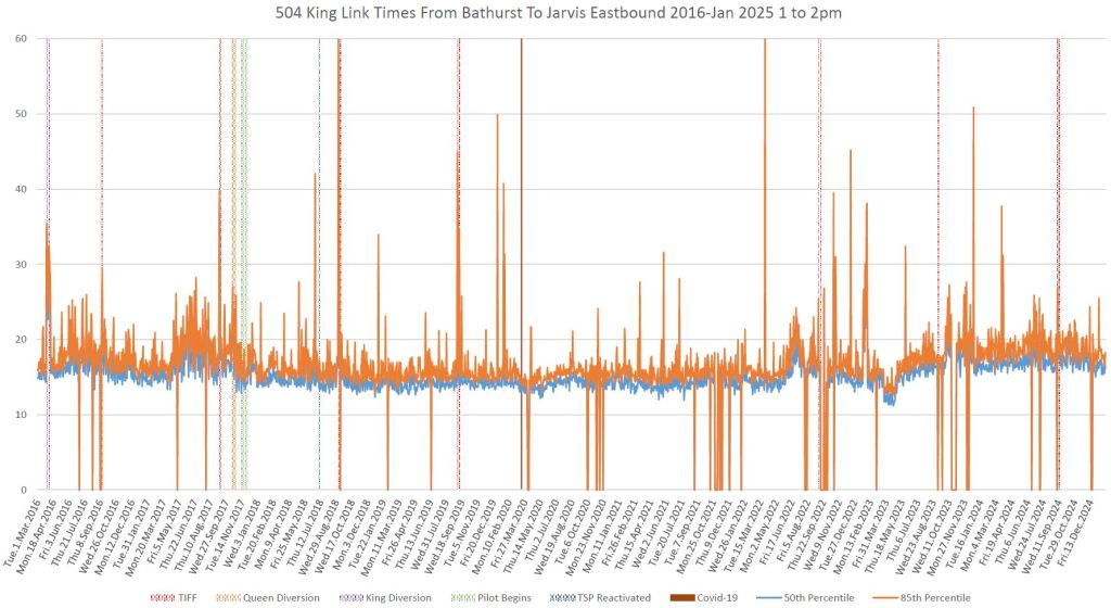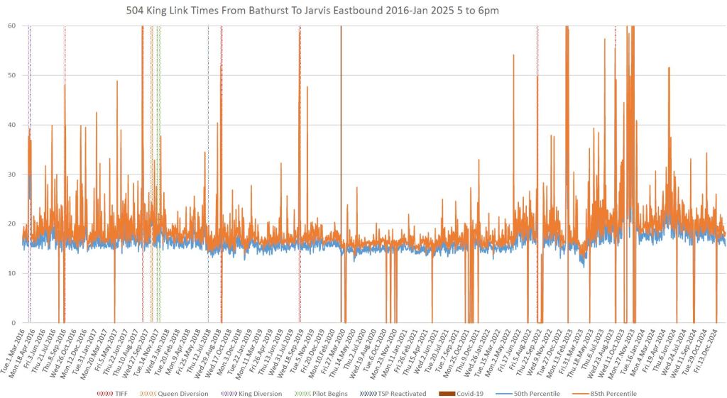 In previous articles, I have posted charts showing the changes in travel times on the central portion of the 504 King route between Jarvis to Bathurst. This is the area covered by the supposed transit mall, although the degree to which streetcars actually have priority has varied over time for various reasons.