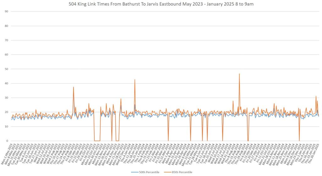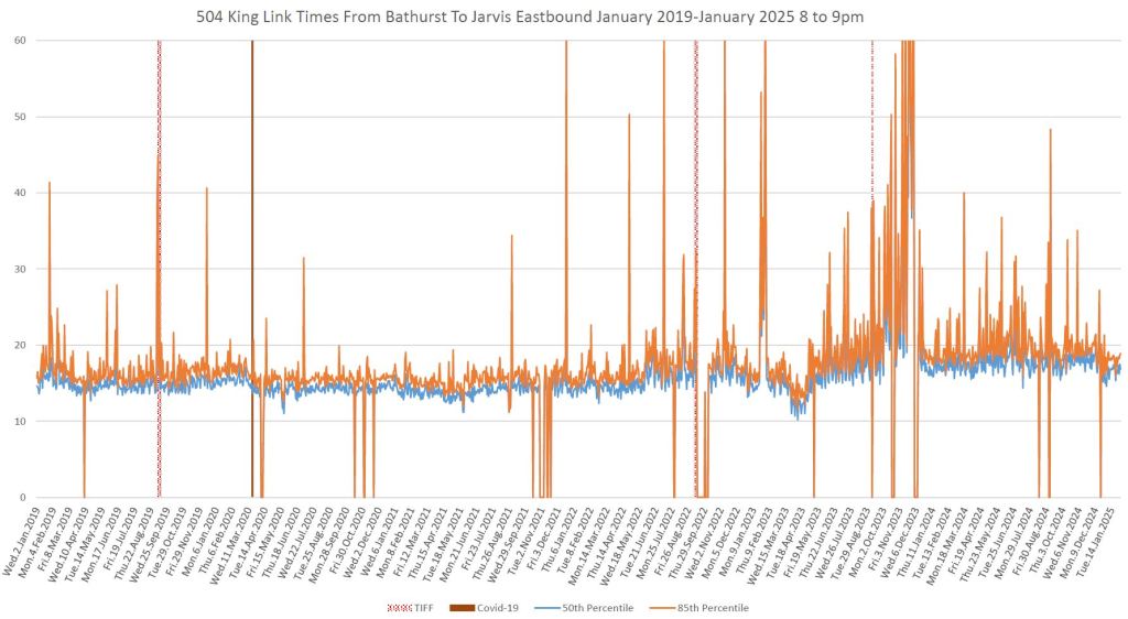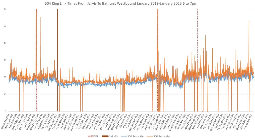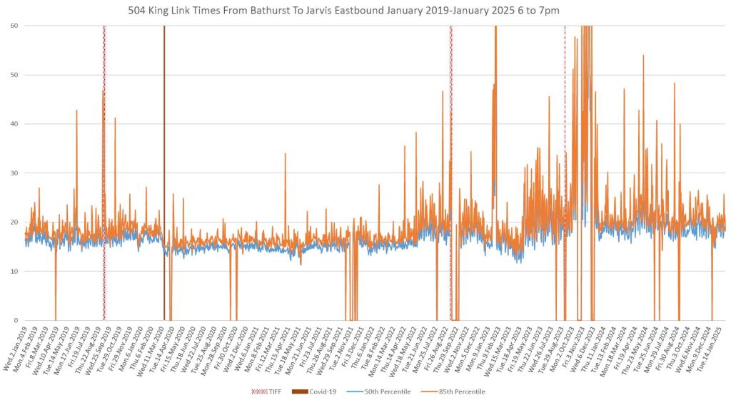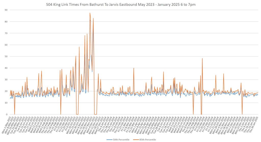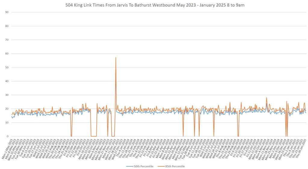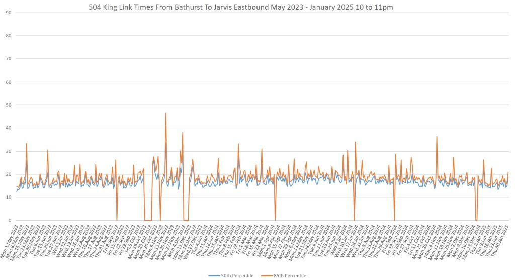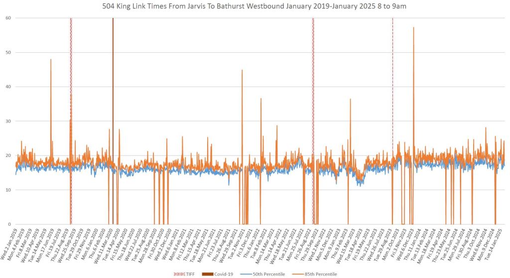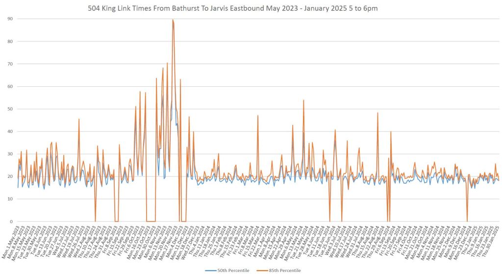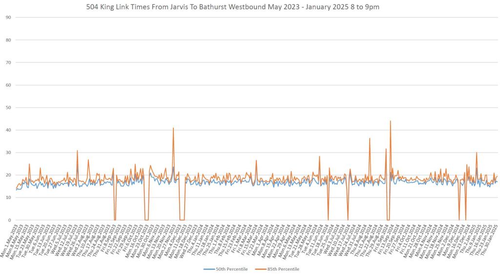 Notwithstanding the apparent stability of travel times looked at in average, service quality leaves a lot to be desired on King with bunching and erratic arrivals of the 504A Distillery-Dundas West and 504B Dufferin-Broadview services. Travel times might be under control, but savings on that account can be undermined by long waits for a streetcar to appear. I will turn to that in a future article.