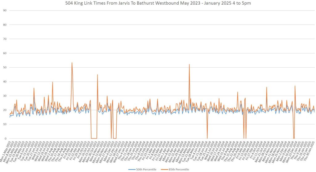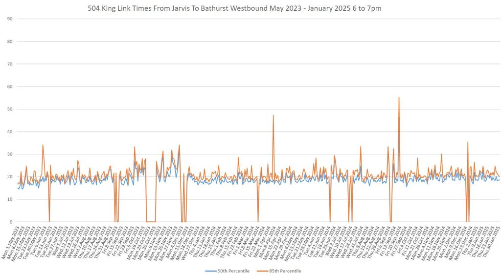 This section presents travel time data for recent months on the portion of King Street west of the transit priority area. Although I could produce a longer time series, there would be long gaps corresponding to construction projects that have blocked and rerouted streetcar service. Data from October 2024, when streetcars resumed operation on King West, are included below.