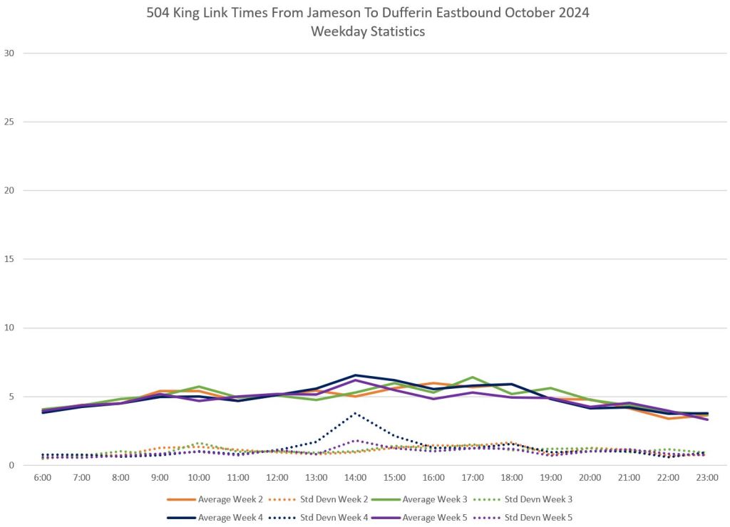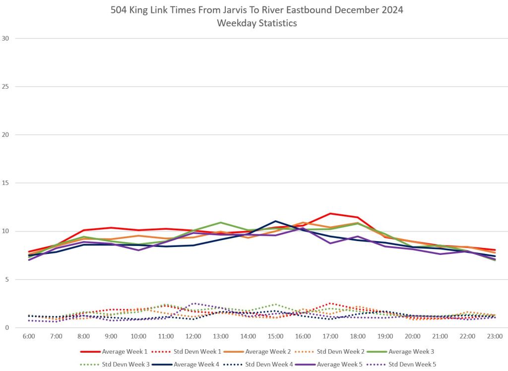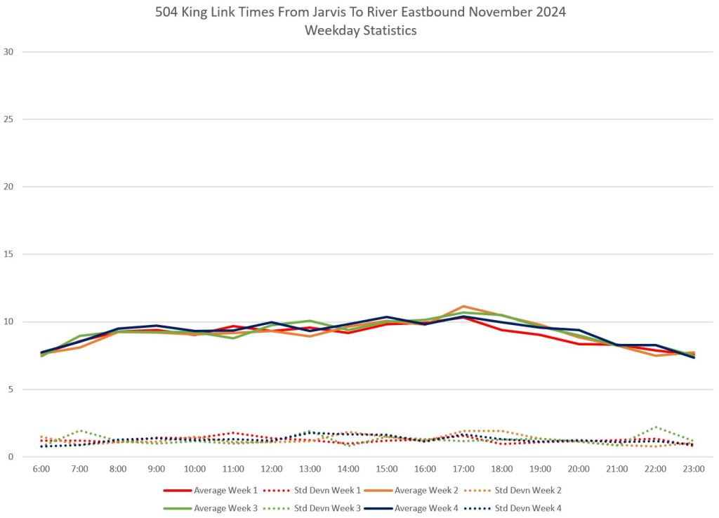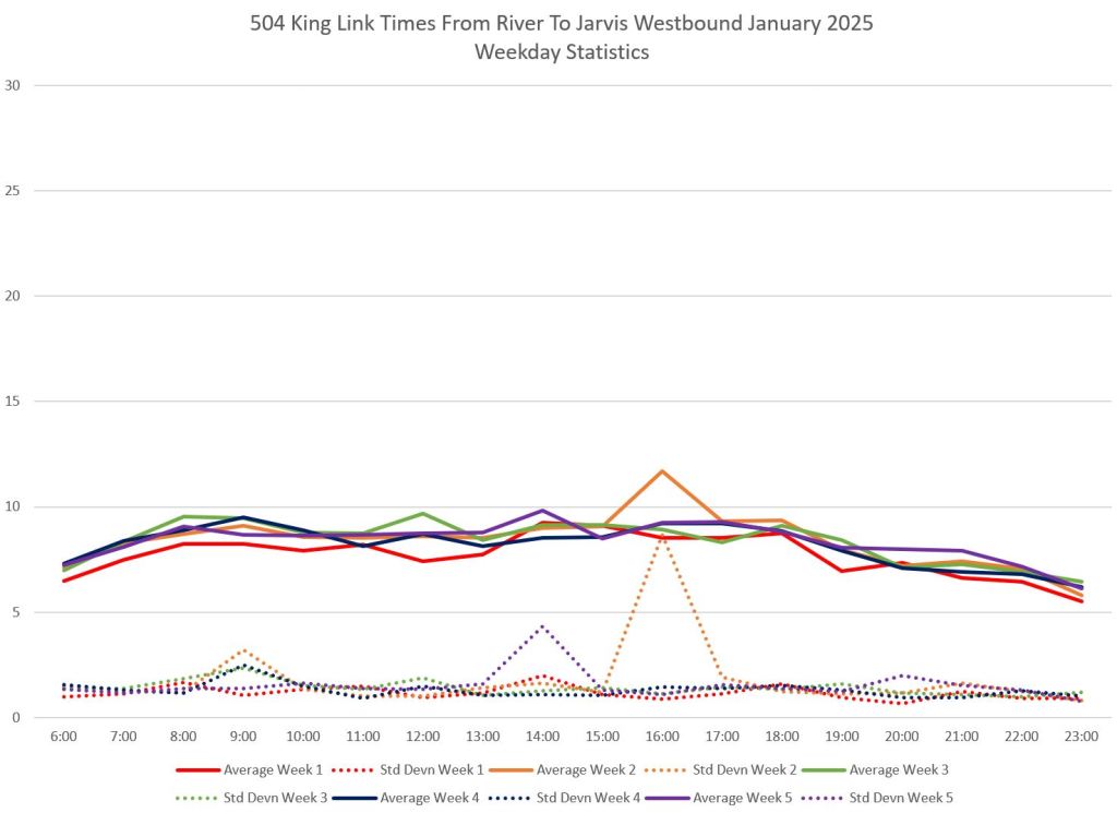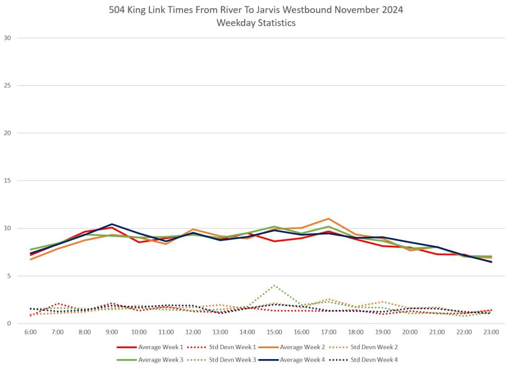 Travel times here are short and vary little as shown by the low values for the standard deviation (dotted lines). If there is anything that needs “fixing” here, it is the signals at Sumach Street by which streetcars and their riders are regularly held.