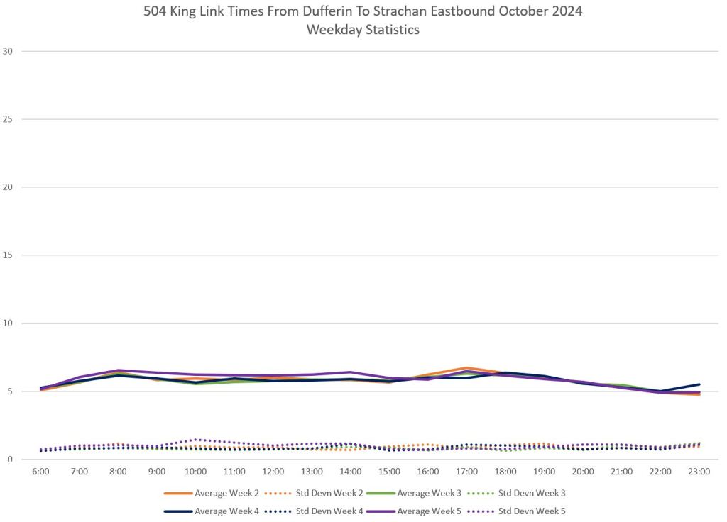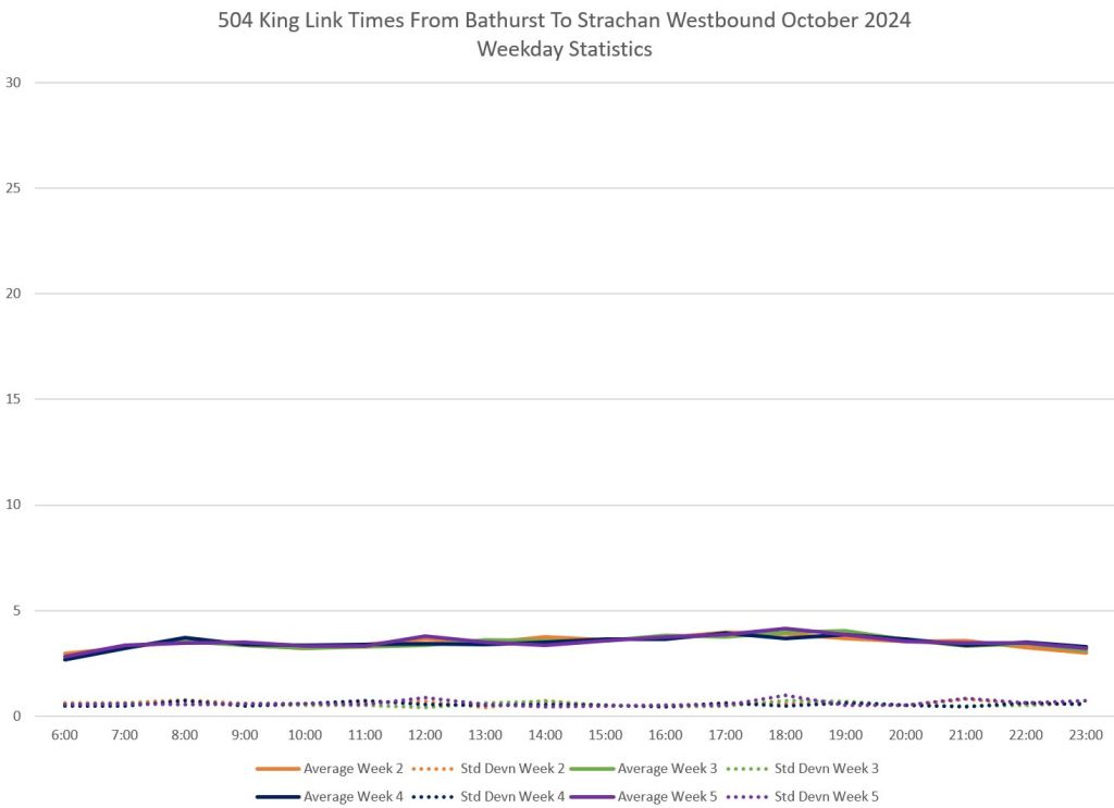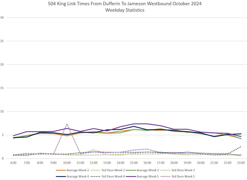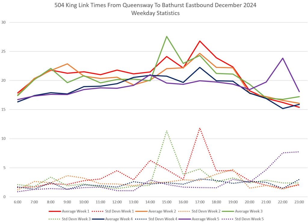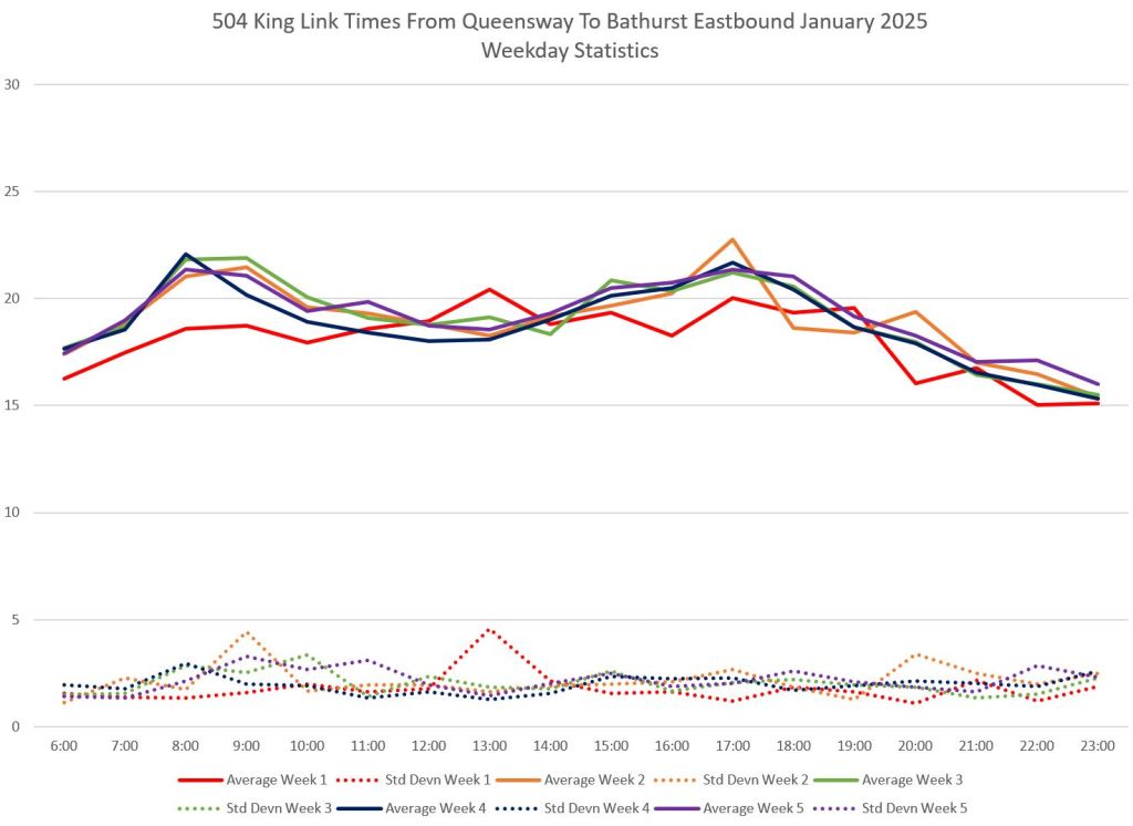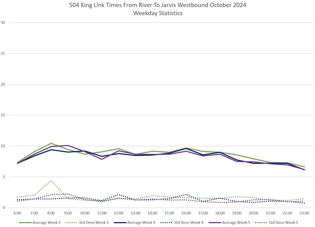 Travel times here are short and vary little as shown by the low values for the standard deviation (dotted lines). If there is anything that needs “fixing” here, it is the signals at Sumach Street by which streetcars and their riders are regularly held.