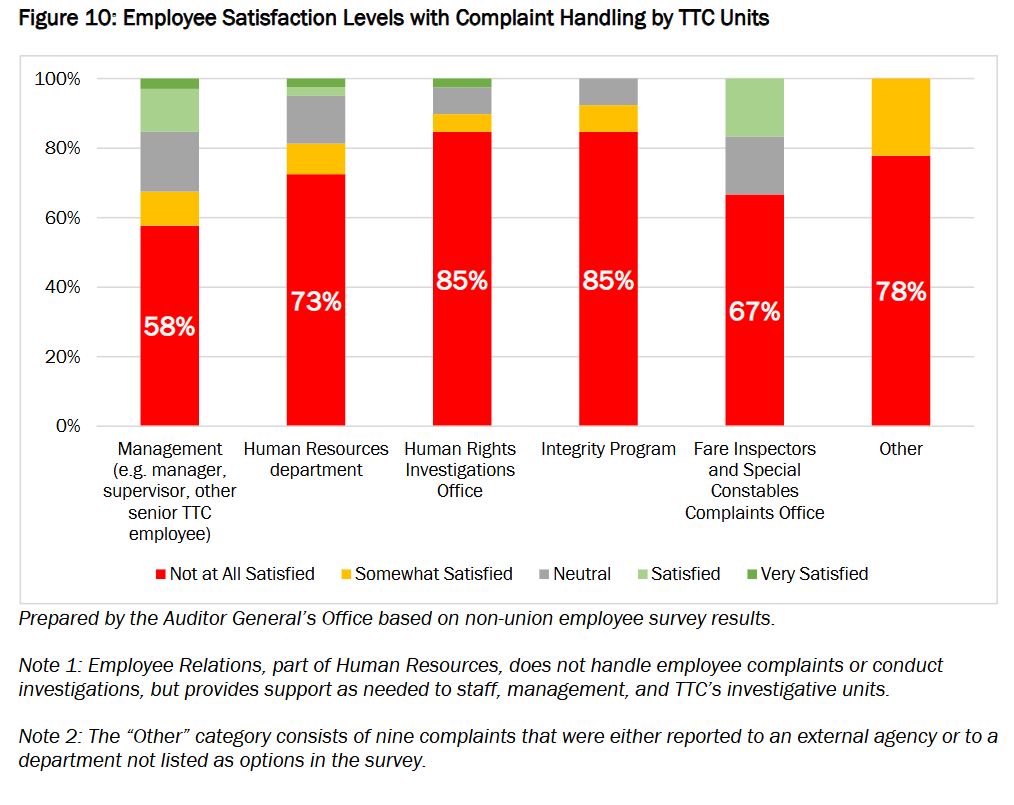The TTC has three separate groups responsible for handling employee complaints in addition to reports to a manager and via the the Integrity unit and the Whistleblower policy. A problem flagged by the AG is that these groups use different software to track complaints, and there is no mechanism to monitor a complaint if it moves from one investigative group to another.
