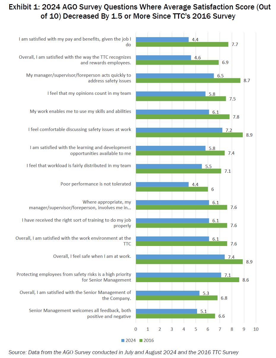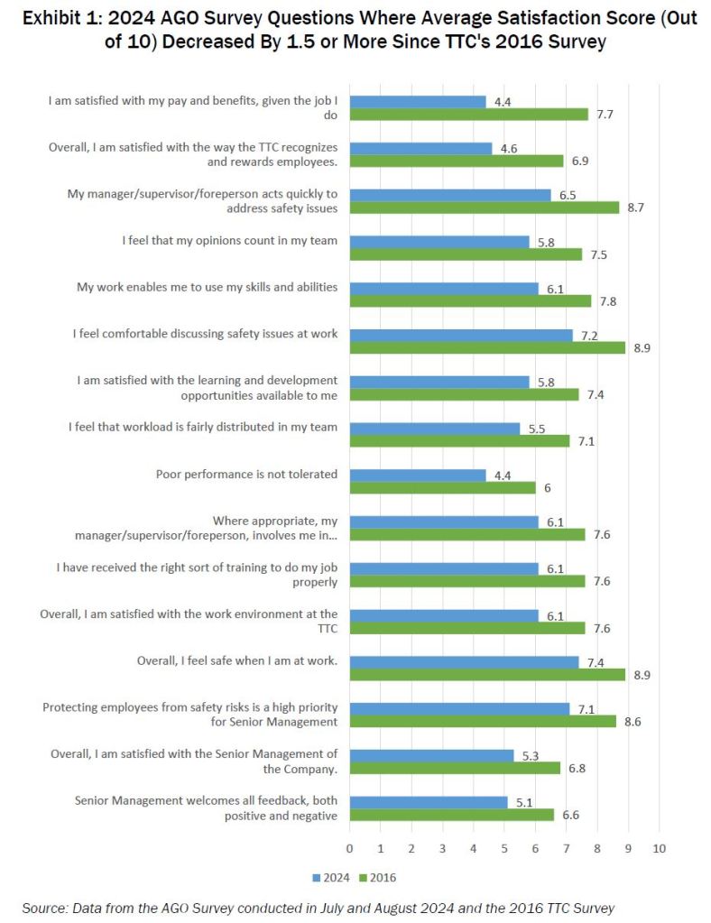 The Auditor General reports that the TTC does not routinely track employee attitudes to their workplace, and the last such survey occurred in 2016. This was near the end of the Byford era as CEO, and no further tracking was done until the AG’s own review in 2024.