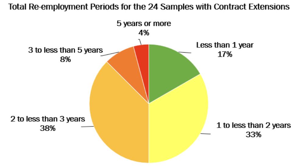 - 52 per cent (16 of 31) of sampled rehired pensioners returned to work for another 1.5 to 5.5 years after their retirement.