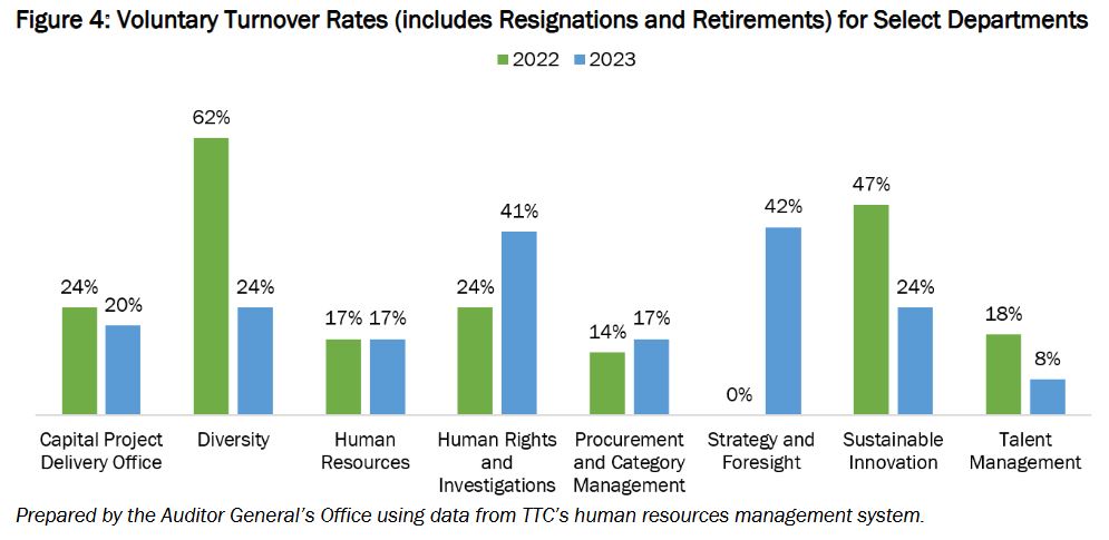 TTC has had a problem with staff leaving by resignation in recent years, and this echoes the experience elsewhere in the public sector. The analysis does not make any reference to departures under duress with severance payments and non-disclosure agreements.