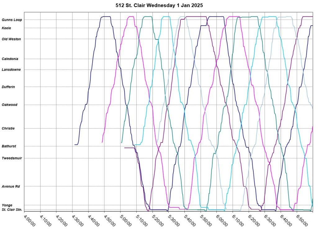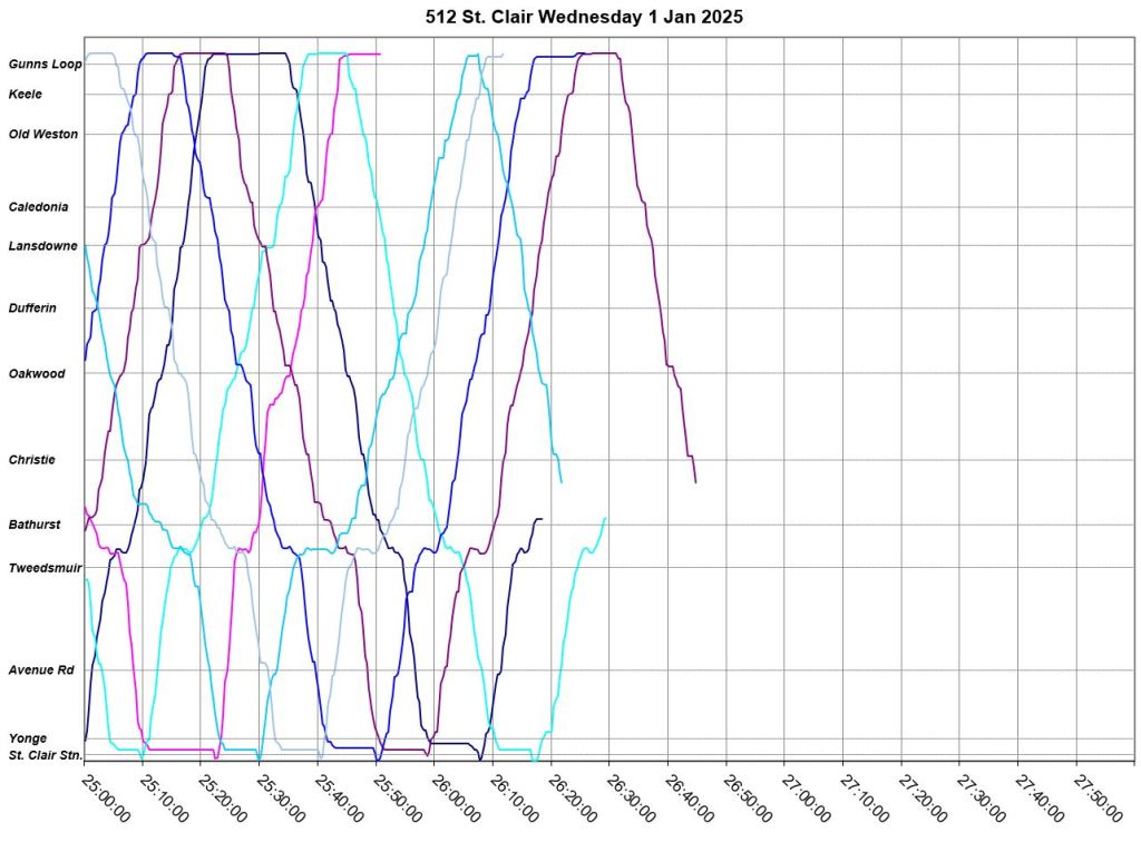 There was no visible congestion on New Year’s Day in the charts. Some bunching occurred thanks to cars taking layovers at St. Clair West Station, and the following car caught up. These were resolved on the return trip from Gunn’s Loop when proper spacing was restored. No cars were short turned at Earlscourt or Oakwood Loops.