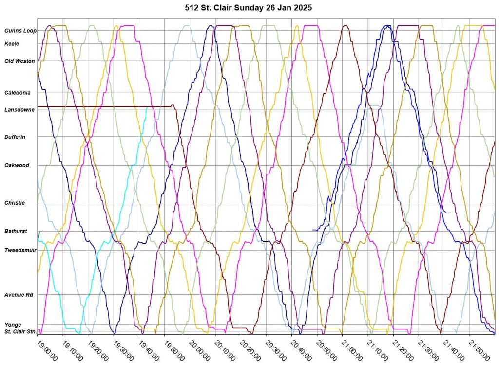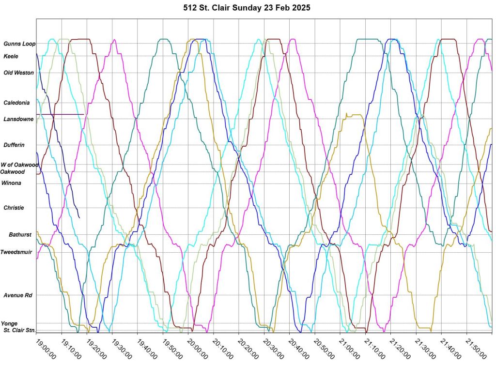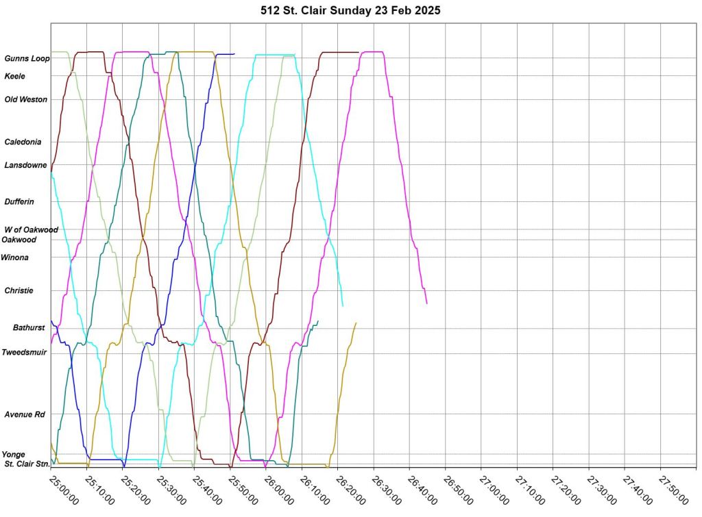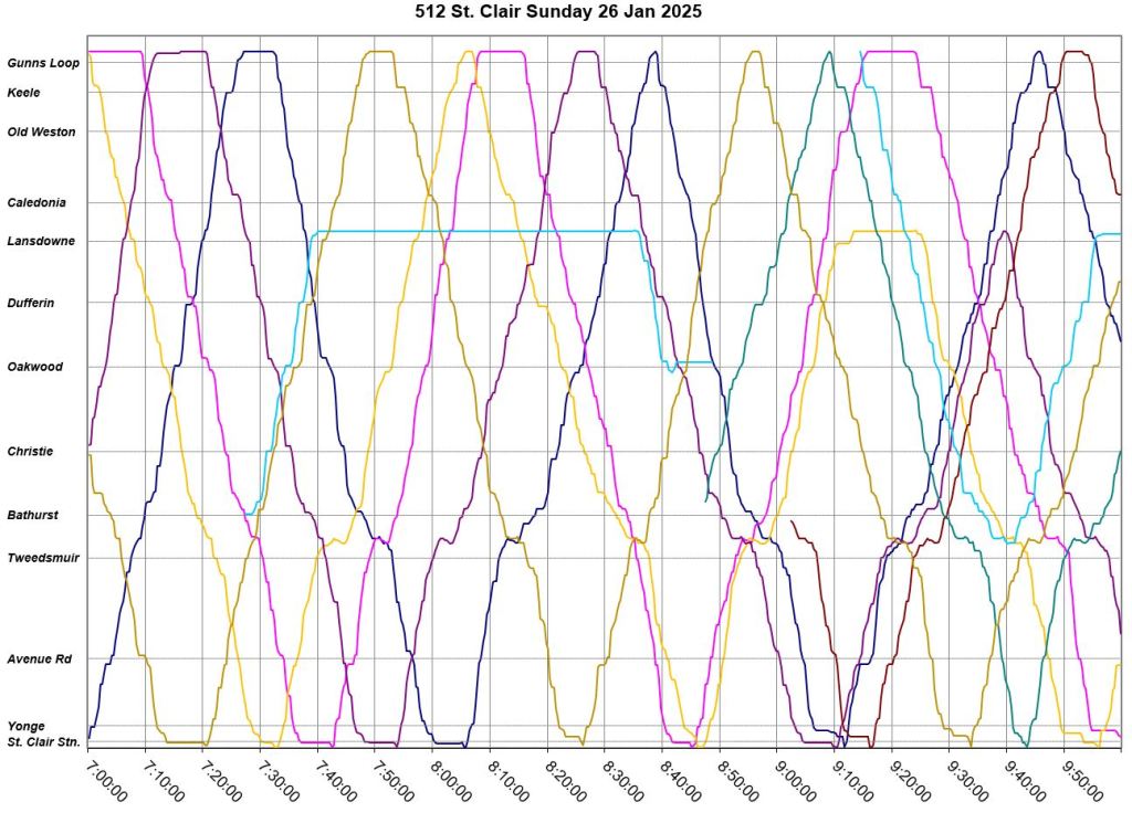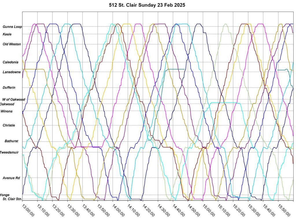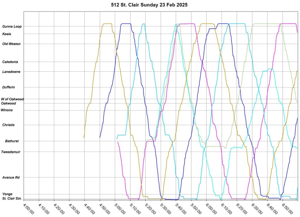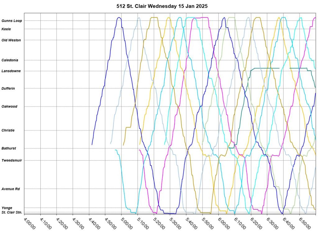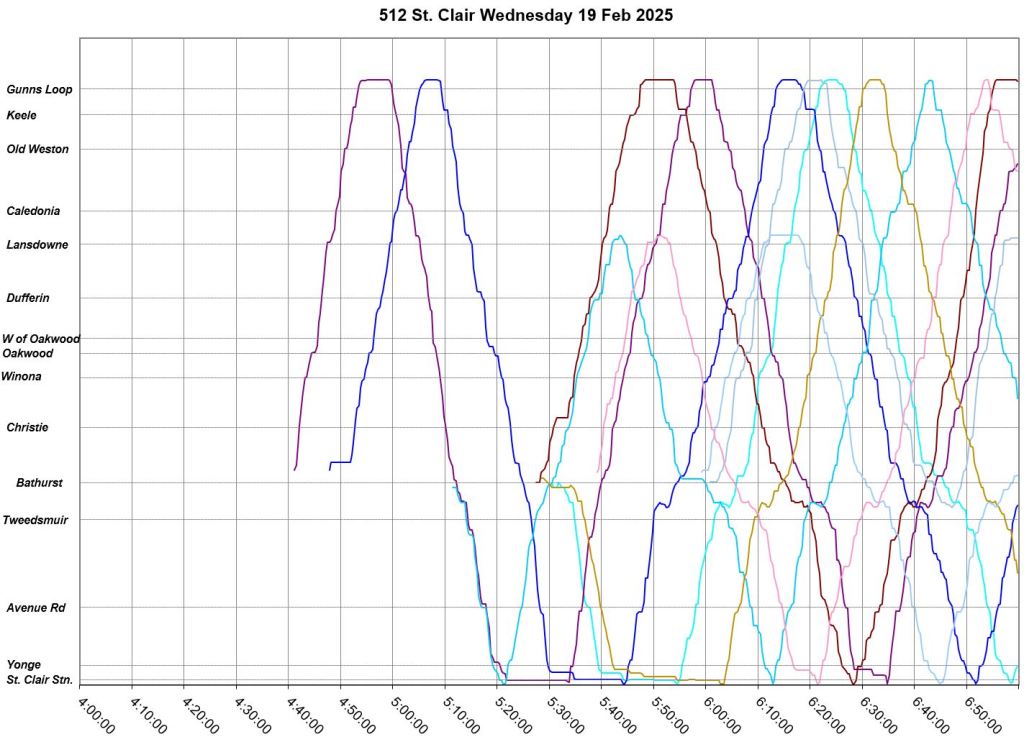 The charts in this section show the movement of streetcars back and forth on the 512 St. Clair route for a few day selected as examples. General notes: