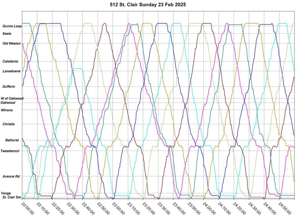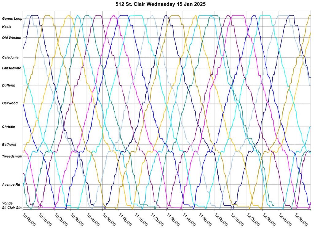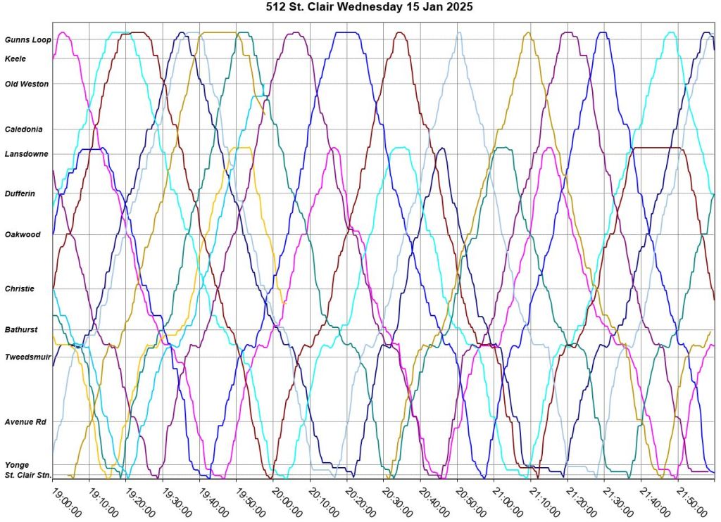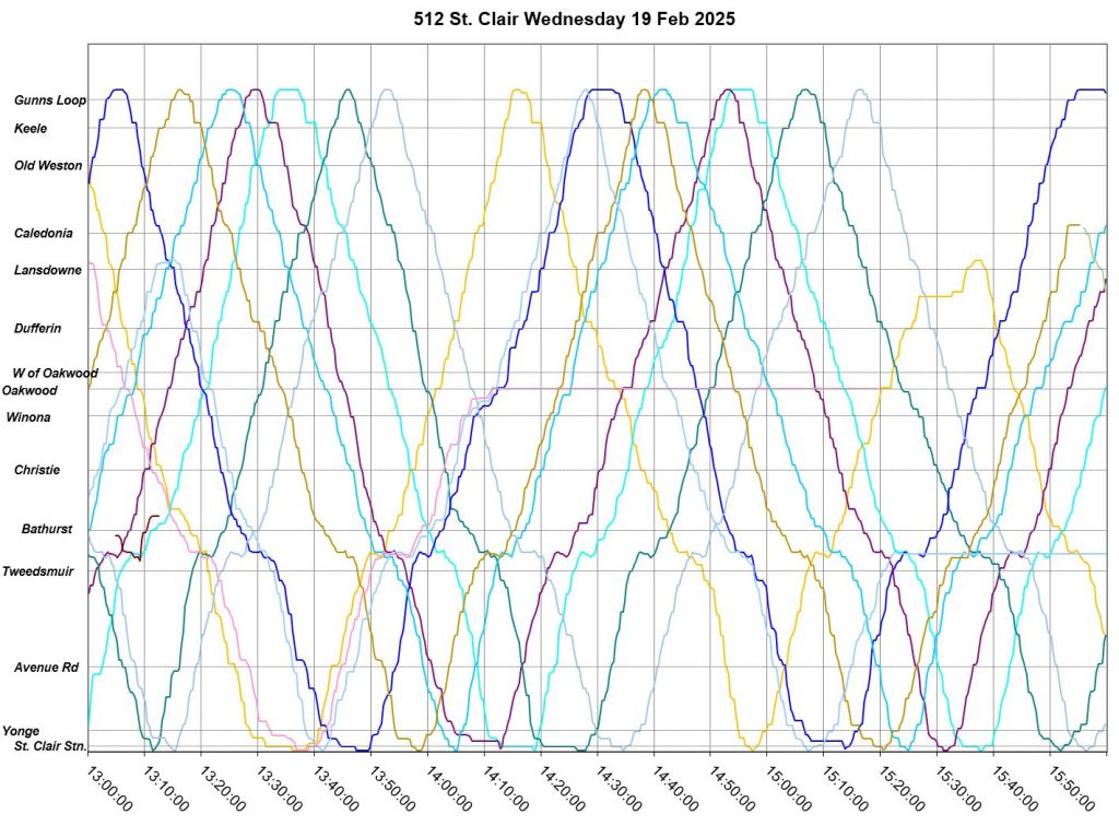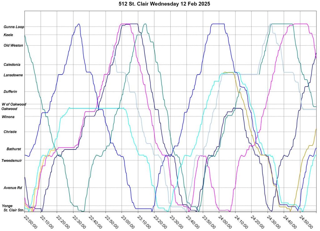- There are “wiggles” in the chart where cars pass through St. Clair West Station. This is due both to the time spent at platforms, and for westbound cars, the fact that they travel back east a short distance while looping.