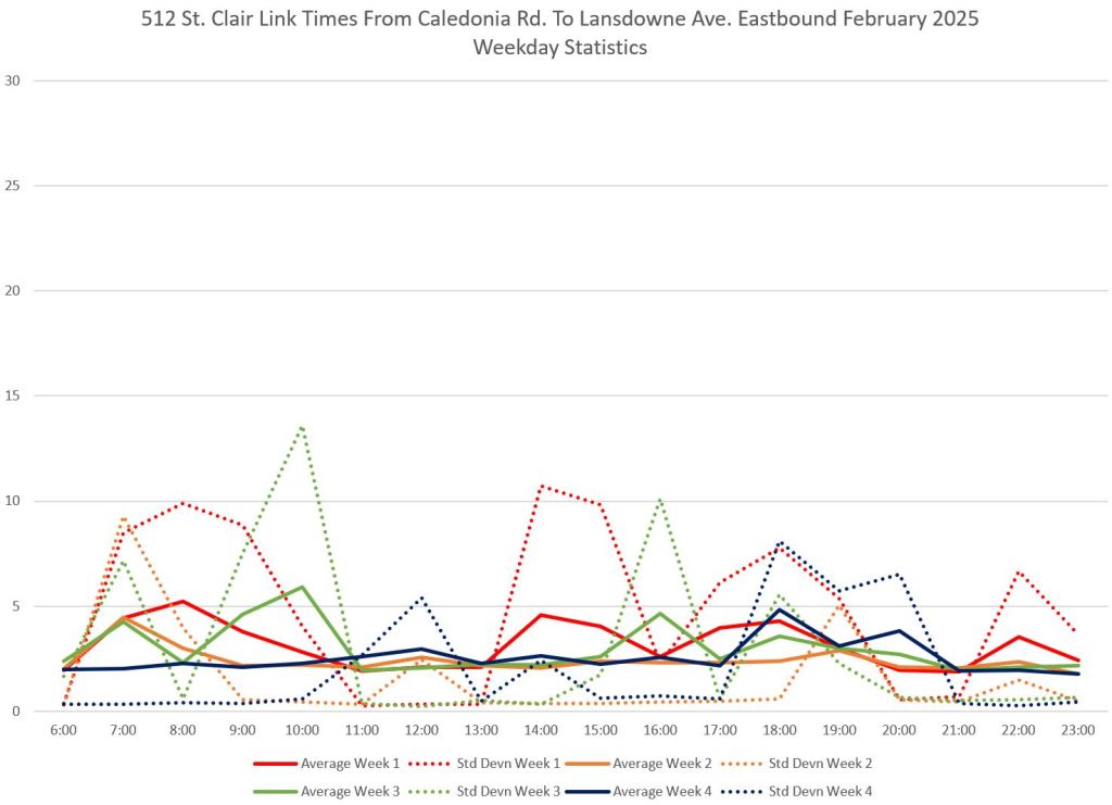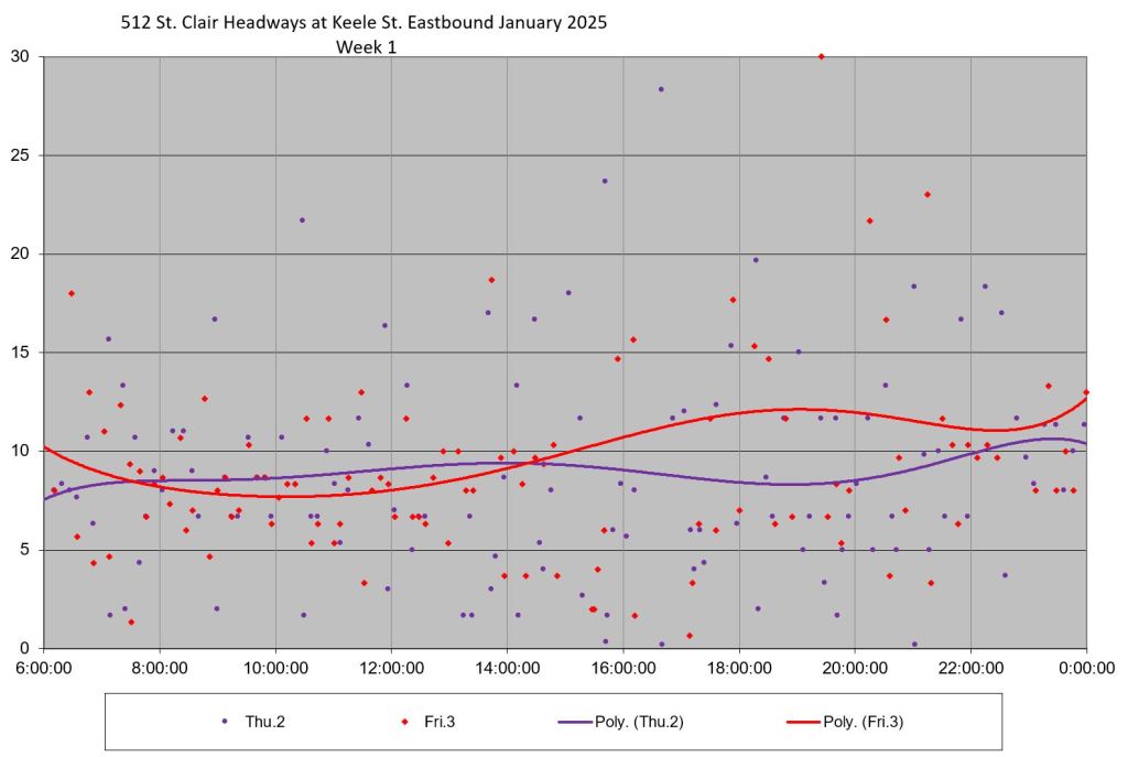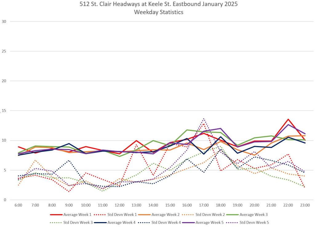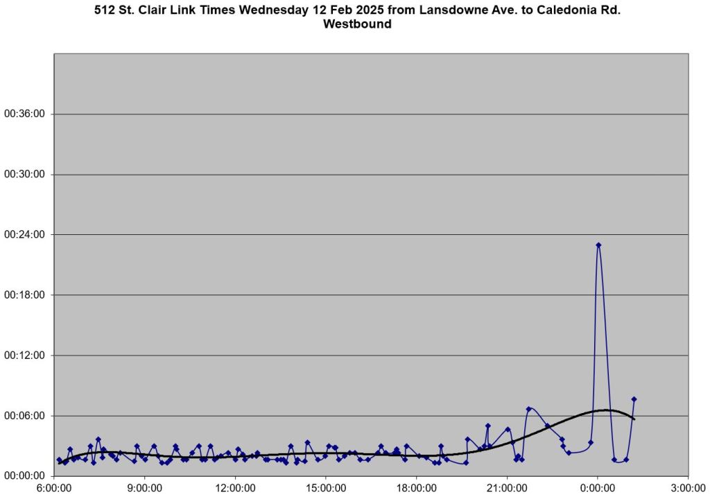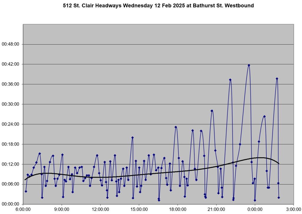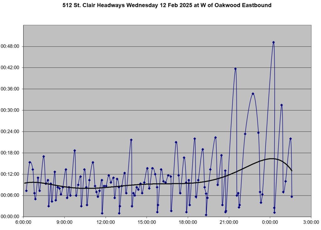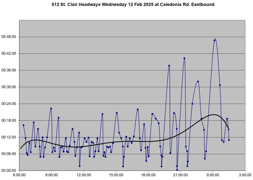 The charts in this article show both the travel times and headways (spacing between vehicles) for 512 St. Clair in January and February 2025, as well as detailed charts for specific days.