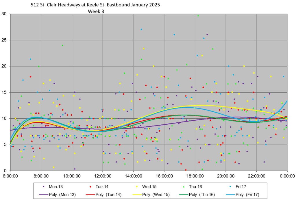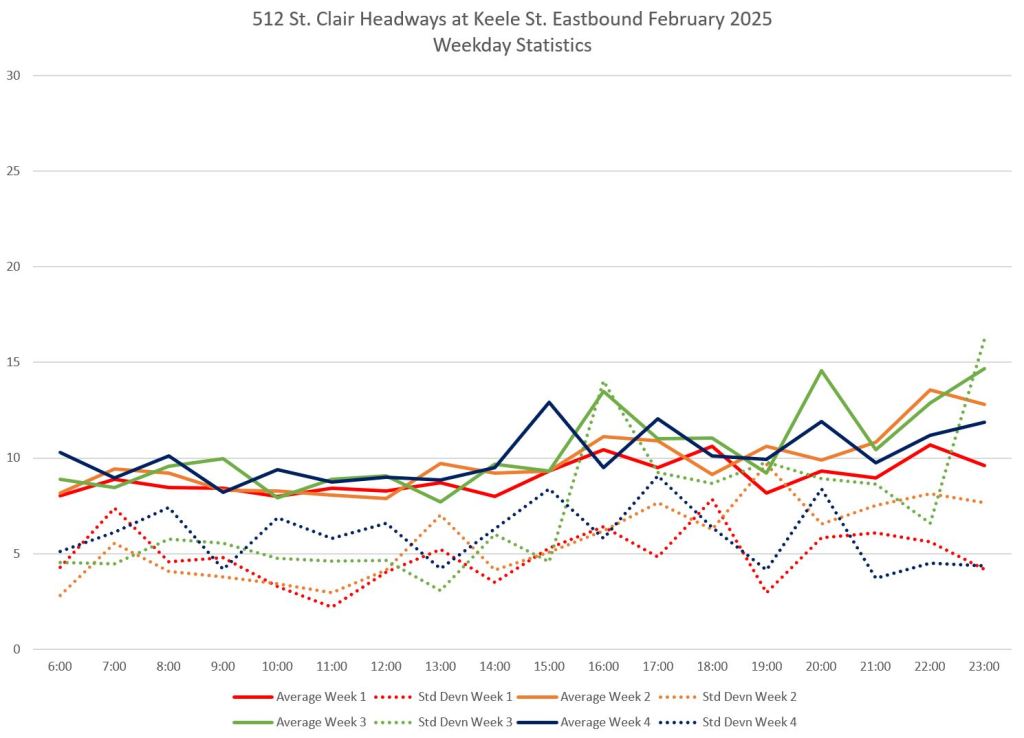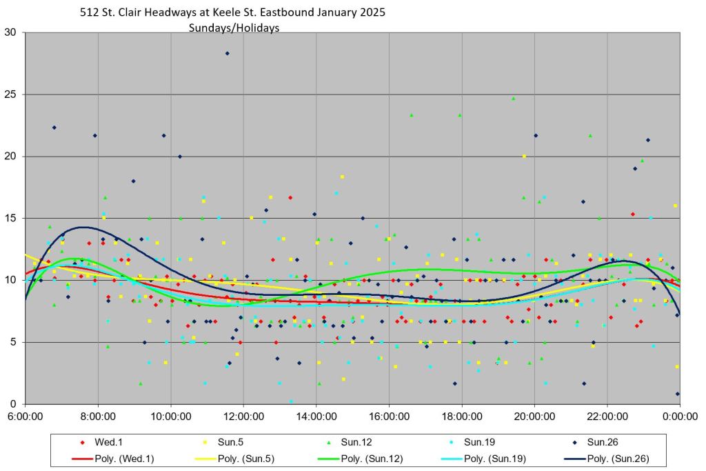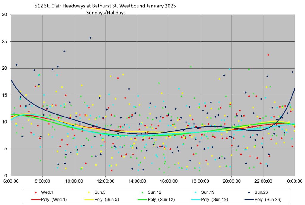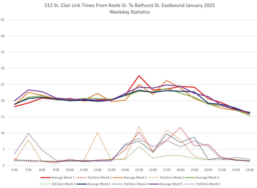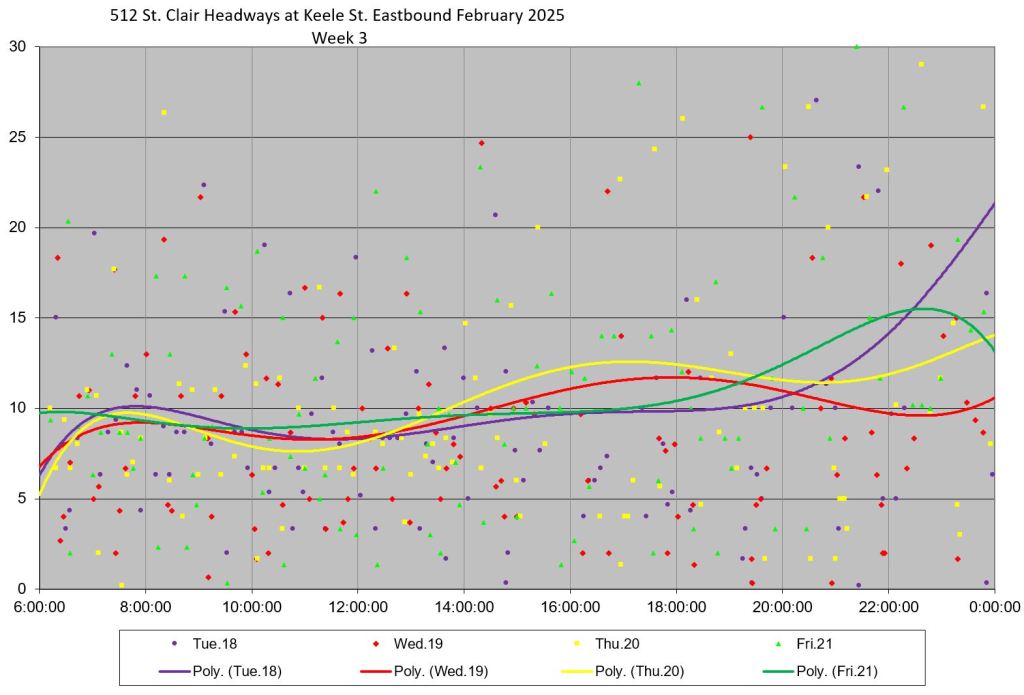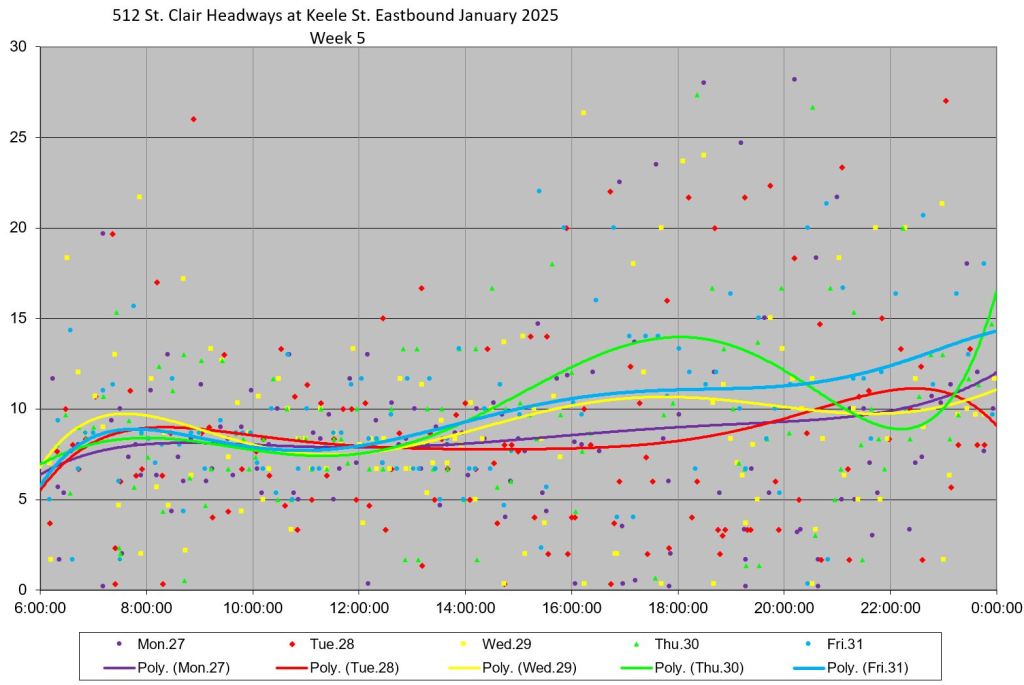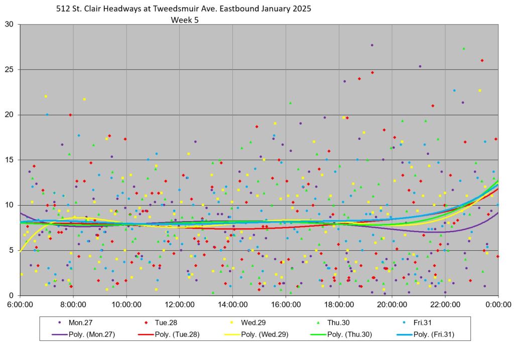 The charts in this article show both the travel times and headways (spacing between vehicles) for 512 St. Clair in January and February 2025, as well as detailed charts for specific days.