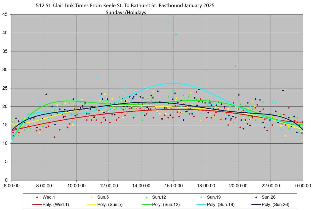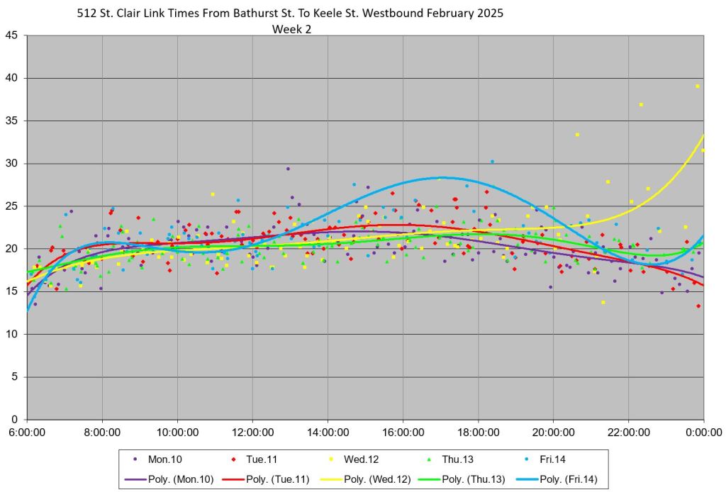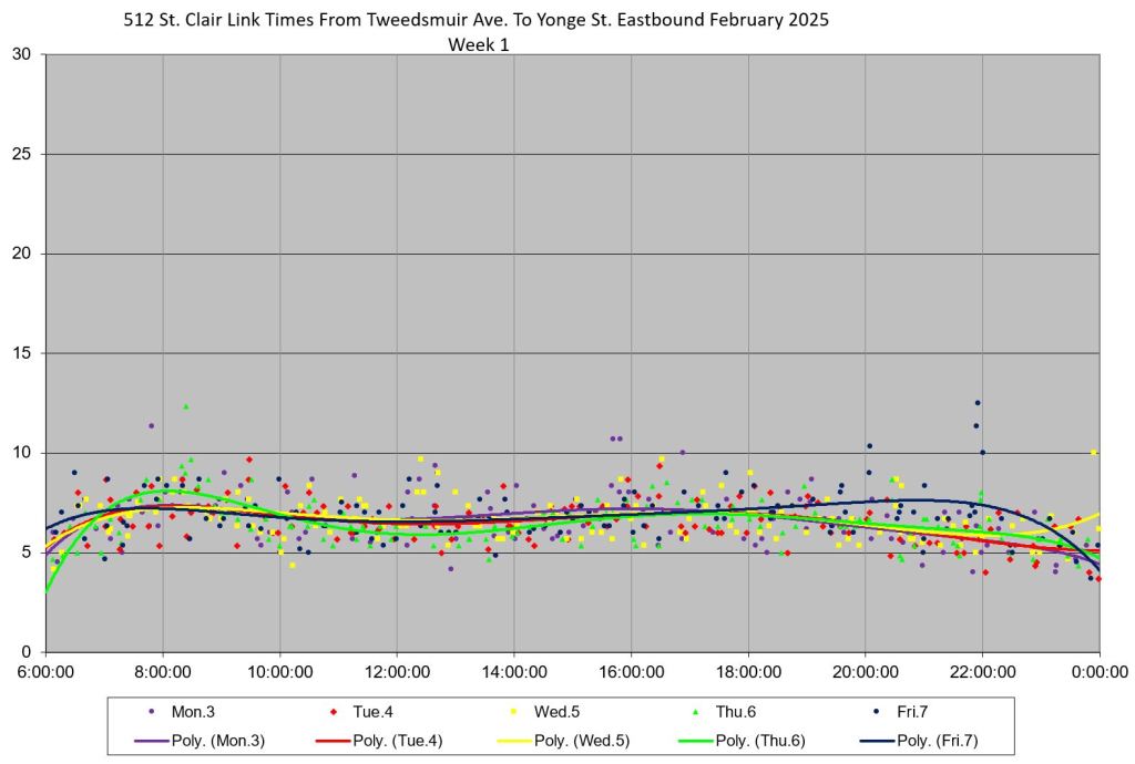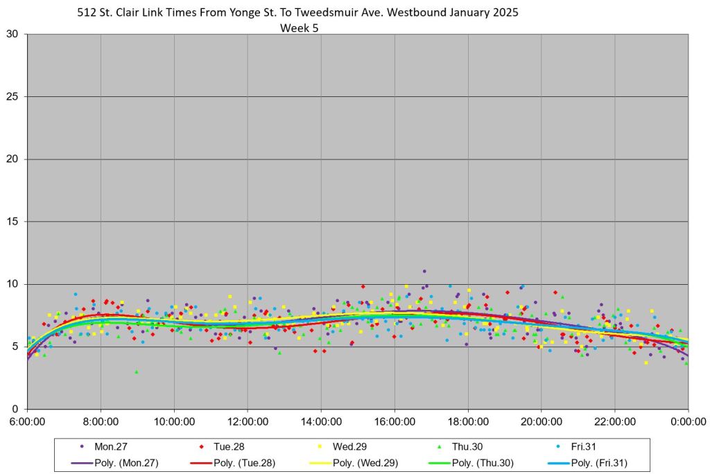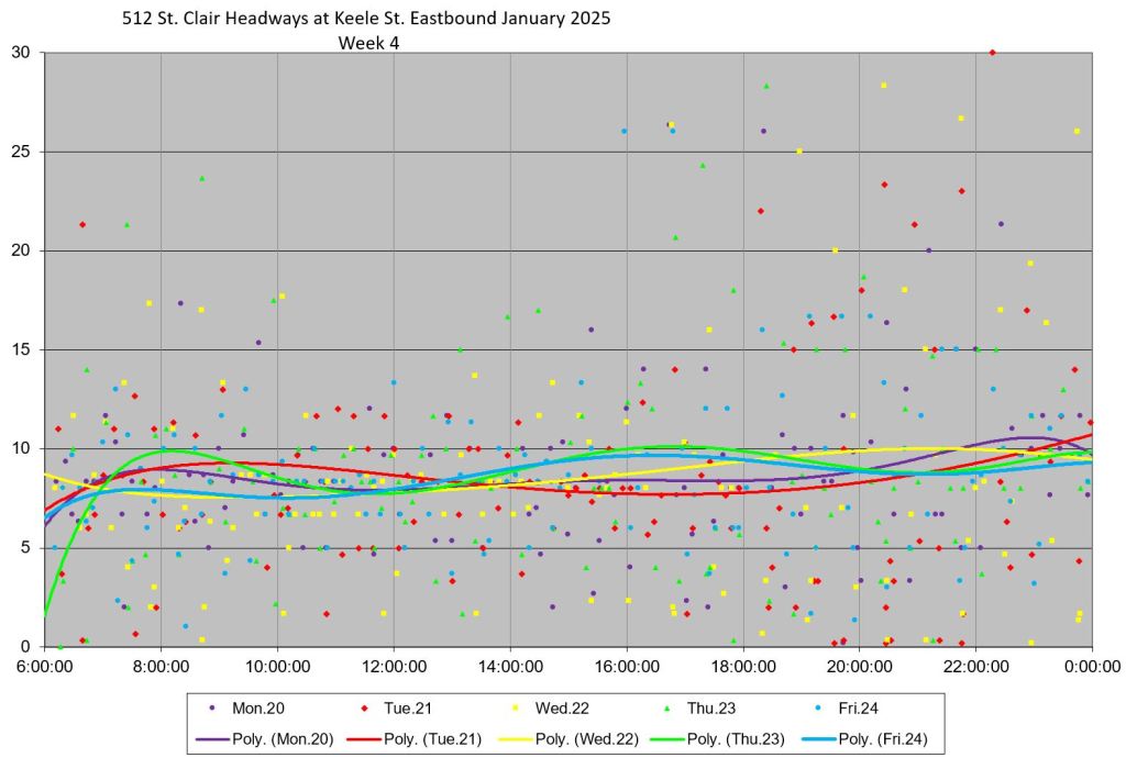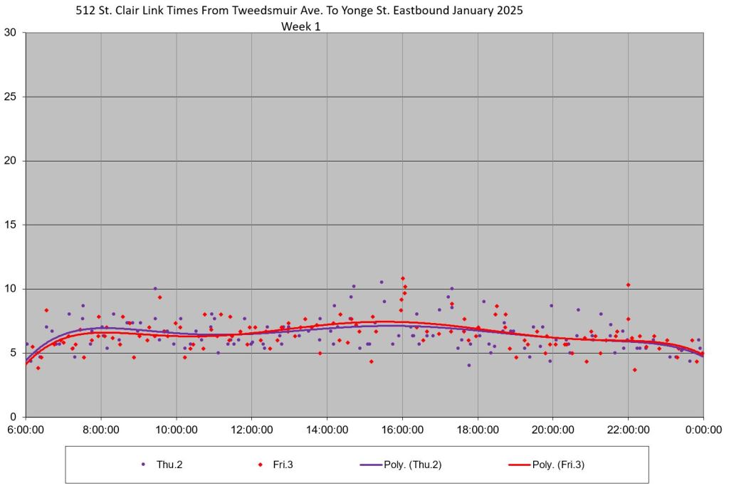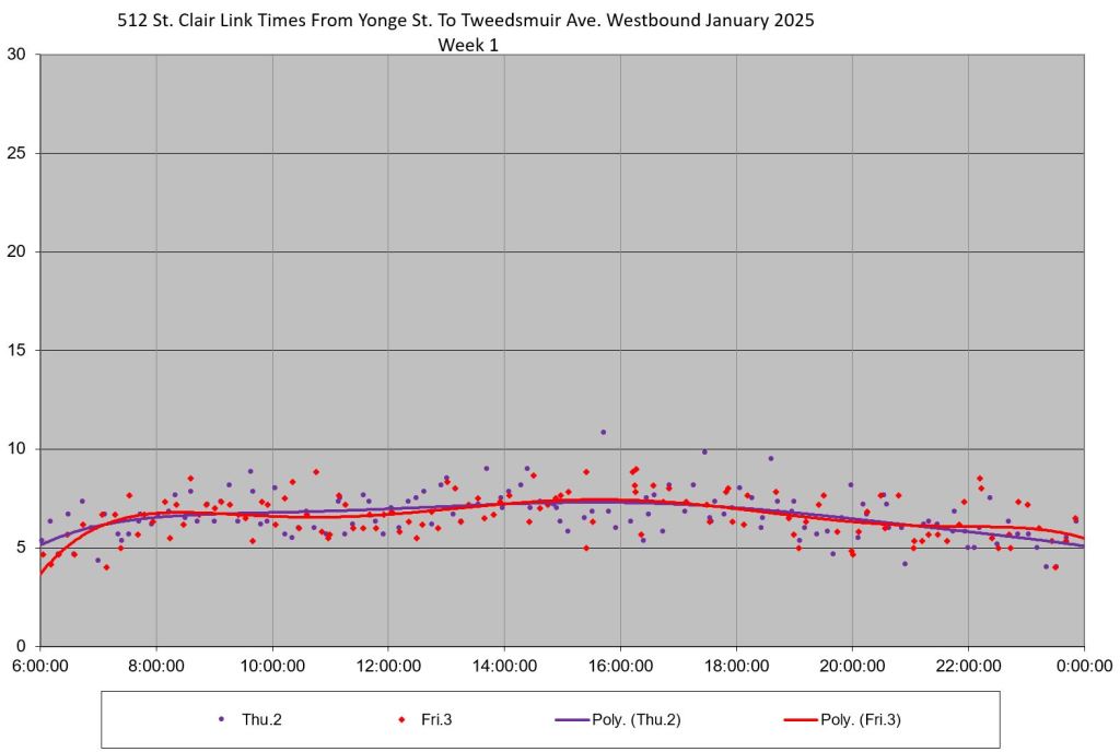The charts in this article show both the travel times and headways (spacing between vehicles) for 512 St. Clair in January and February 2025, as well as detailed charts for specific days.