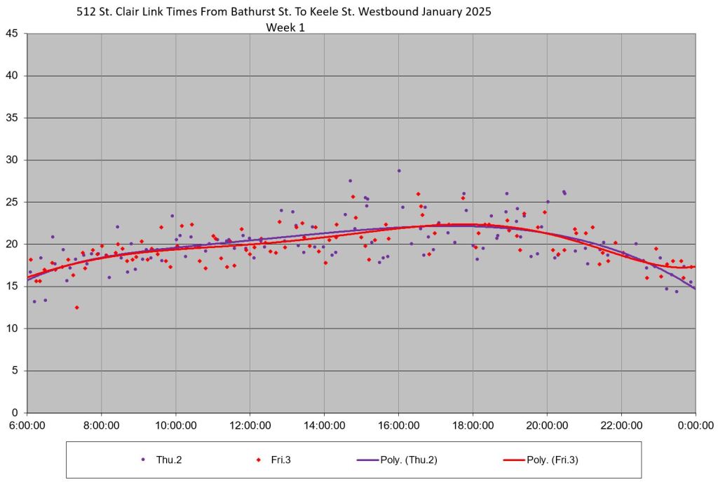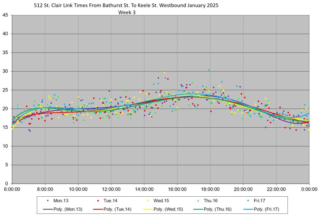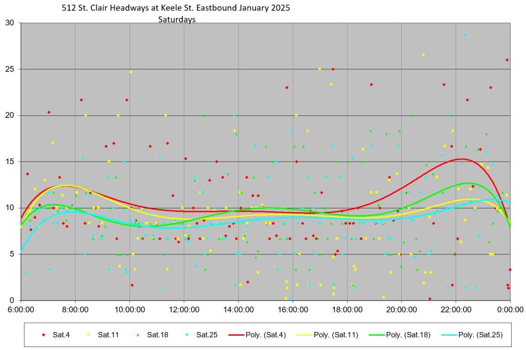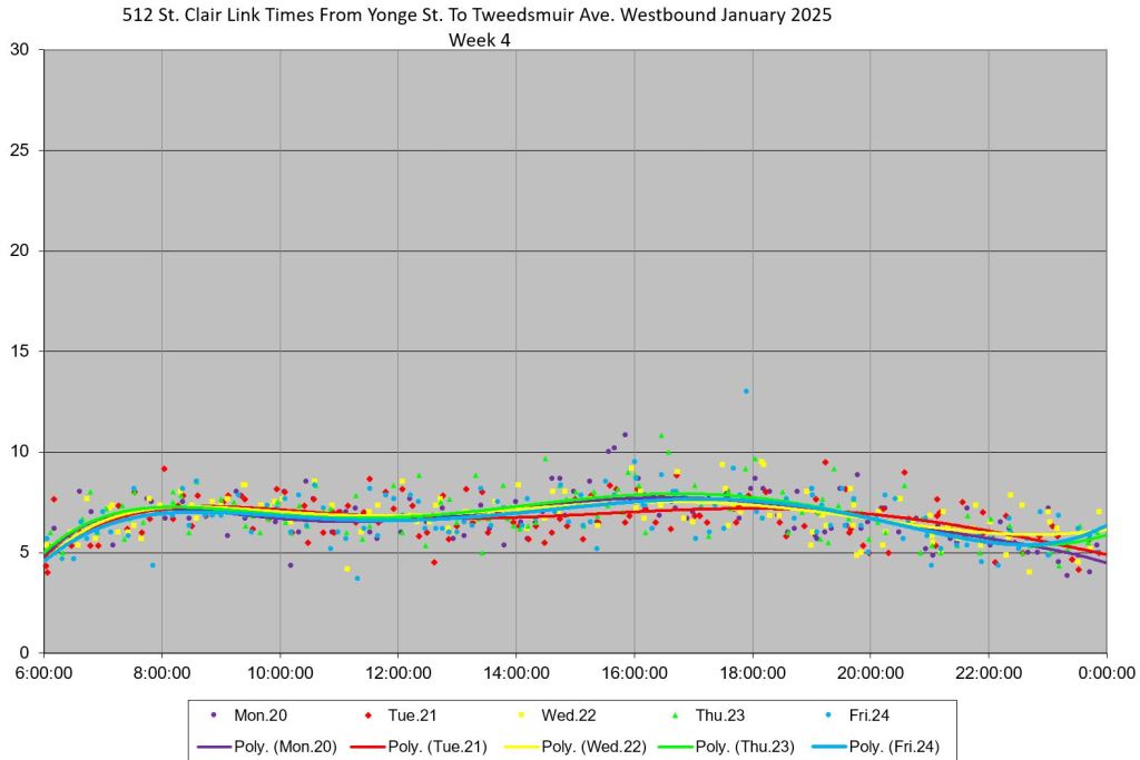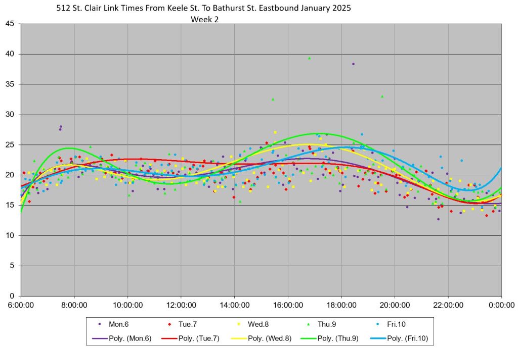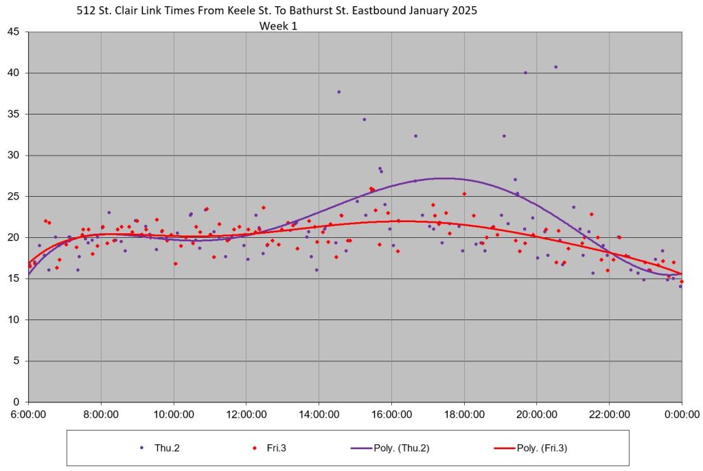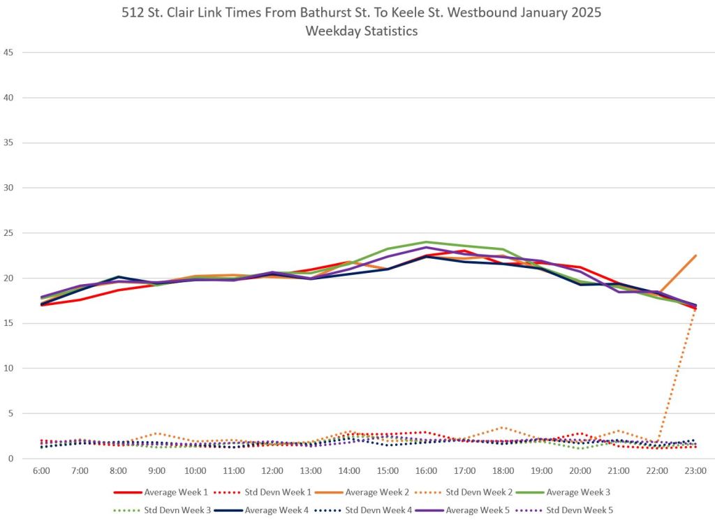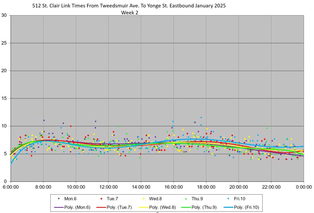 The charts in this article show both the travel times and headways (spacing between vehicles) for 512 St. Clair in January and February 2025, as well as detailed charts for specific days.