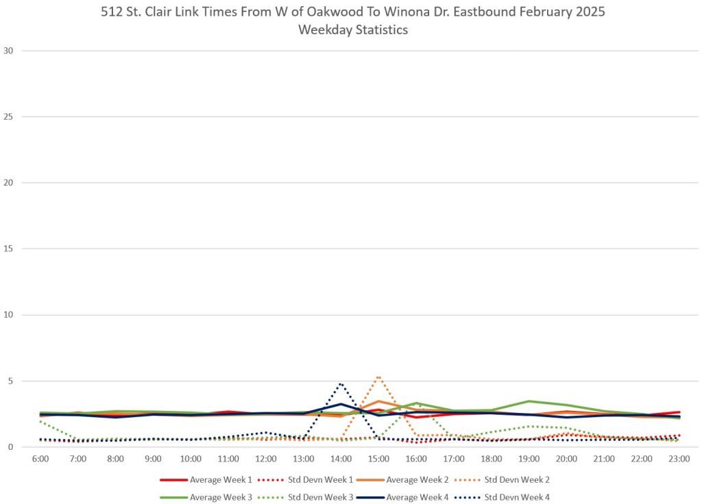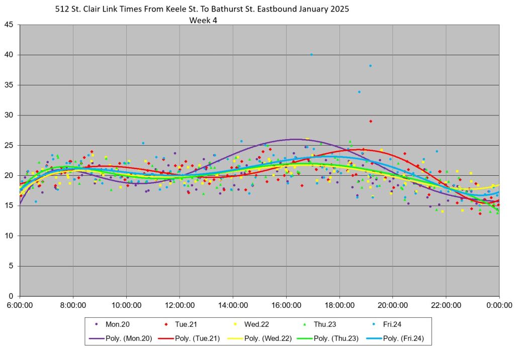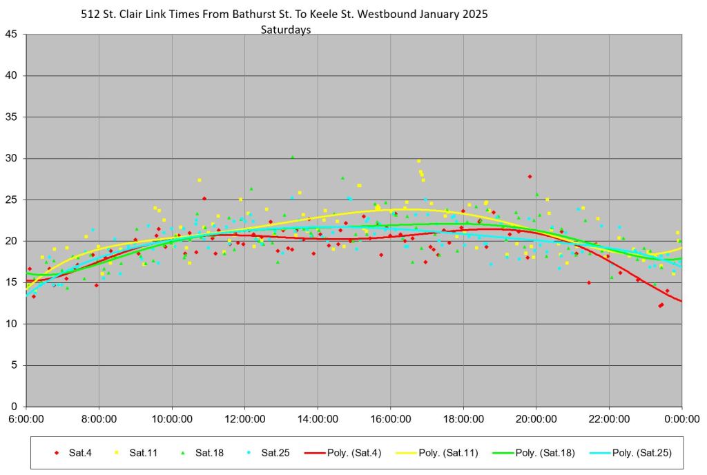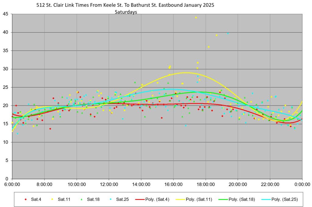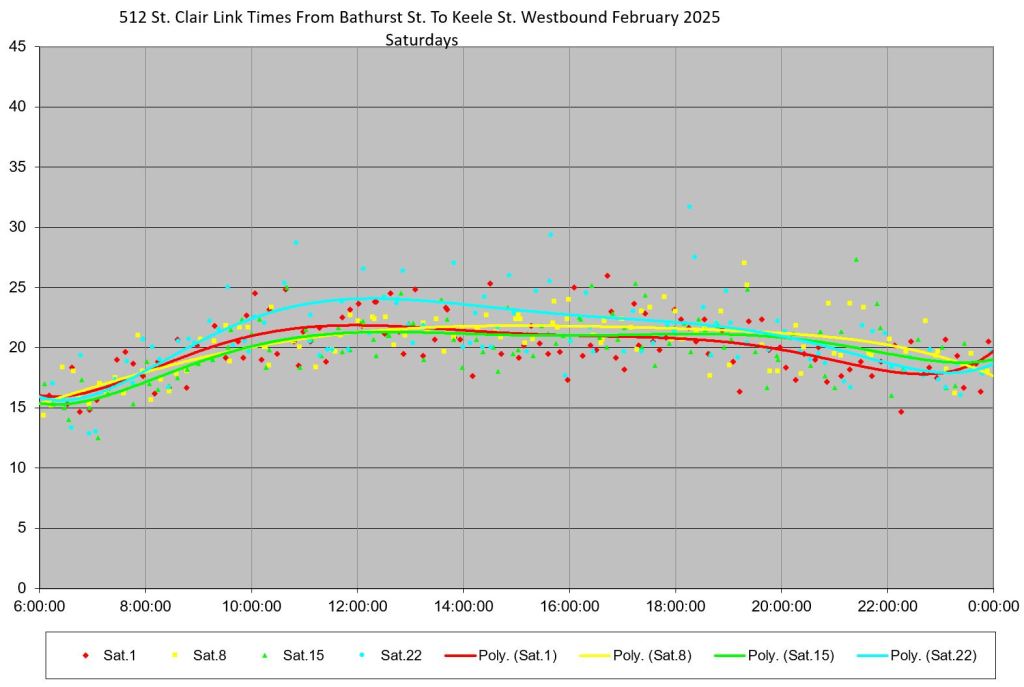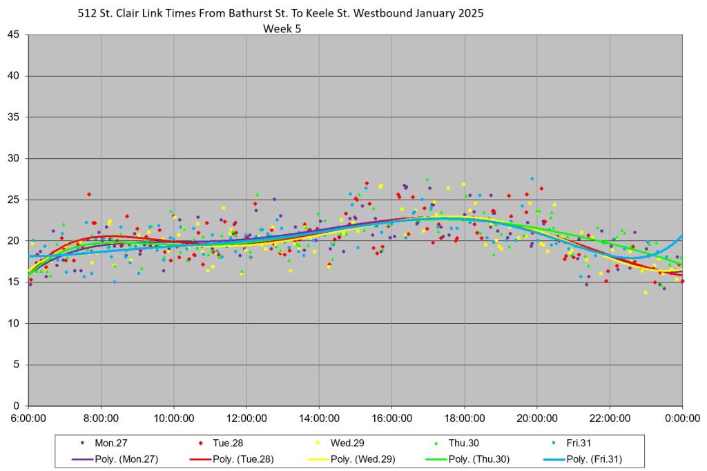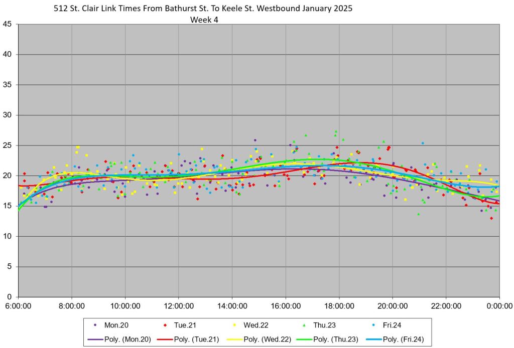 The charts in this article show both the travel times and headways (spacing between vehicles) for 512 St. Clair in January and February 2025, as well as detailed charts for specific days.