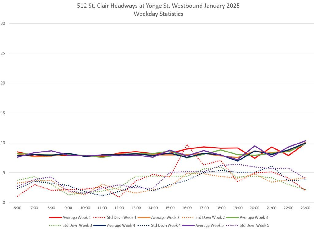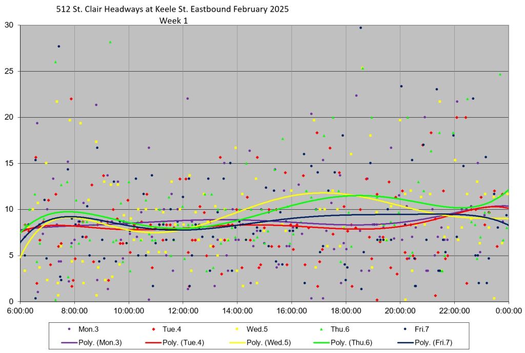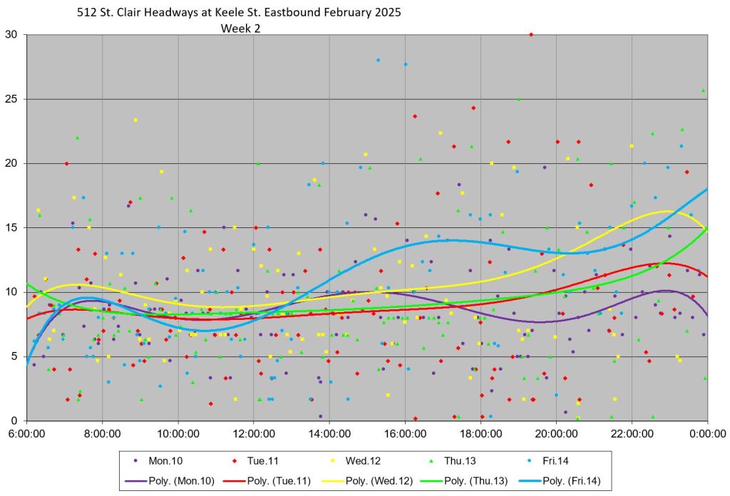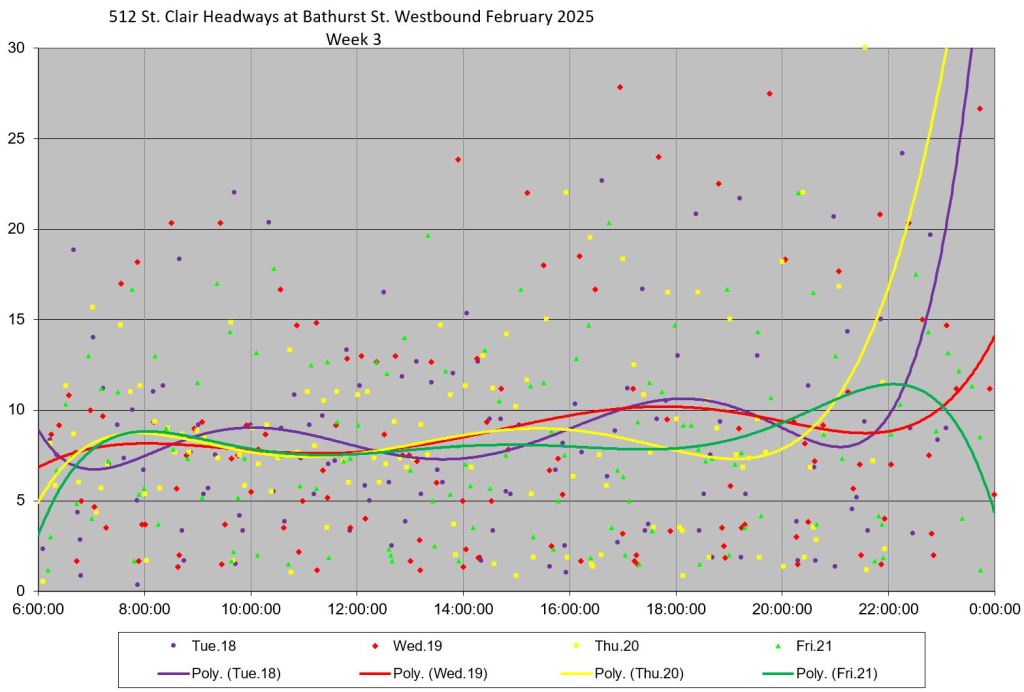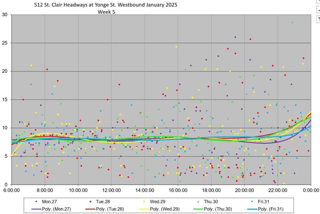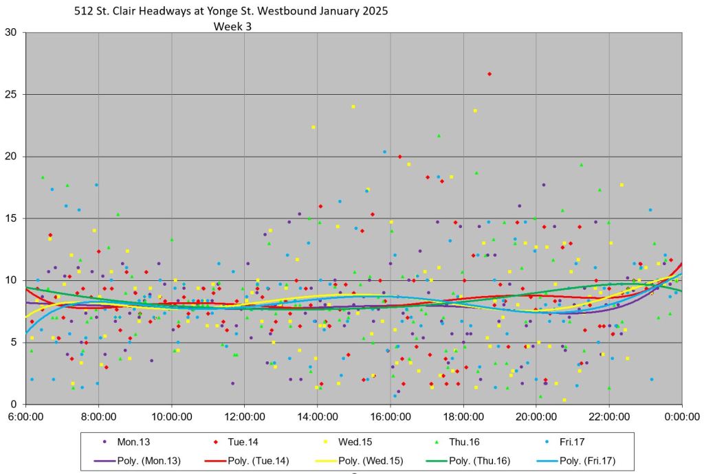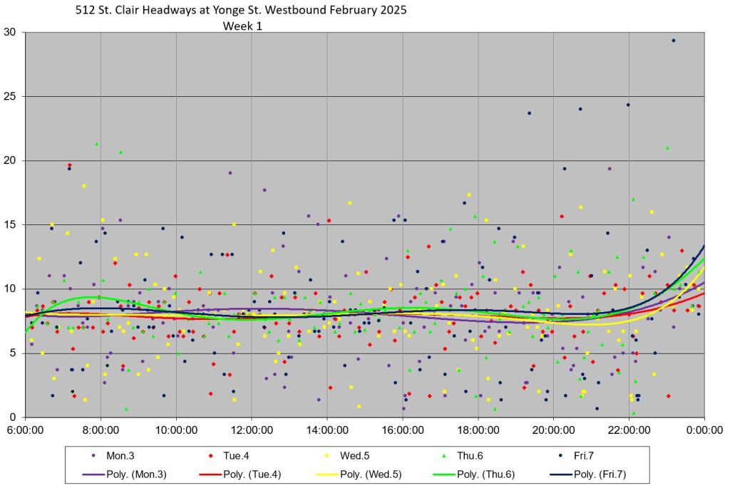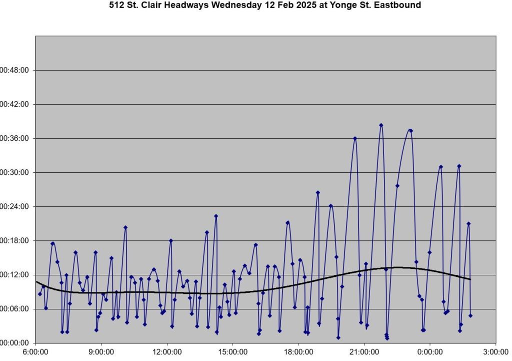 These charts show headways crossing a screenline in the middle of Yonge Street. Departures from St. Clair Station will be slightly earlier, but the scatter in values cannot be explained by traffic interference in the short distance from the station exit to Yonge.