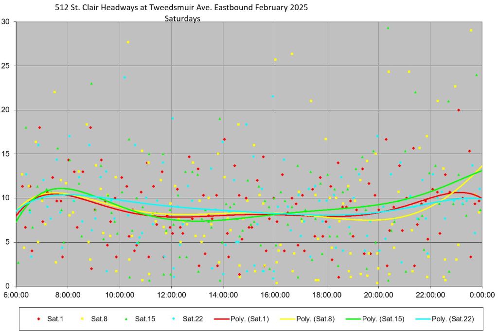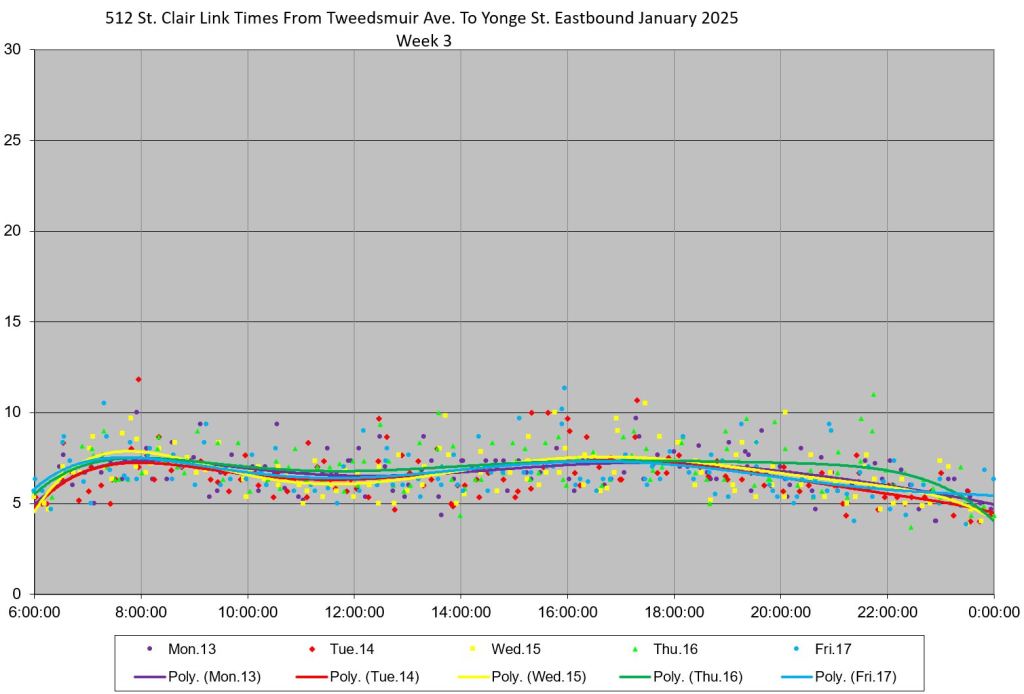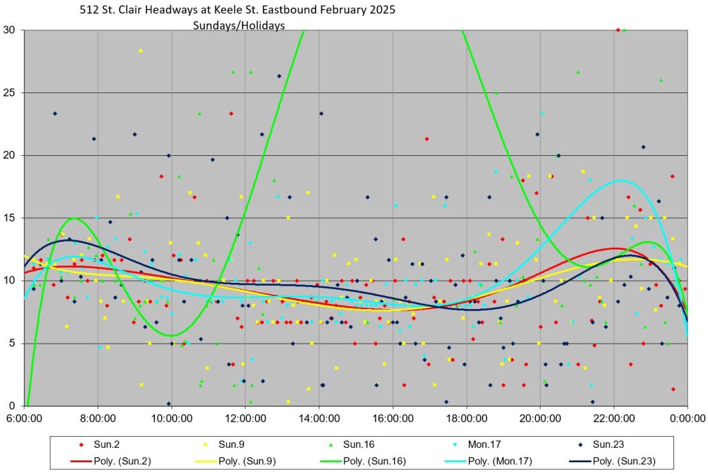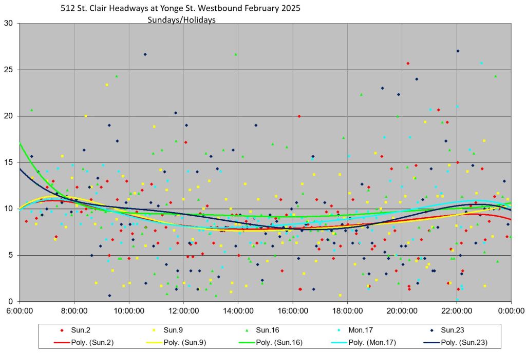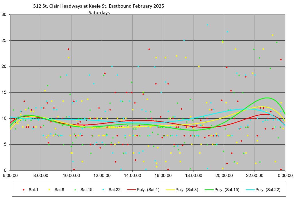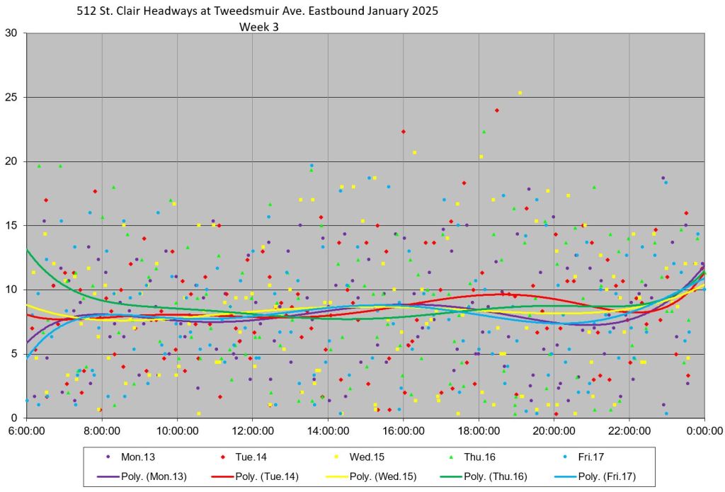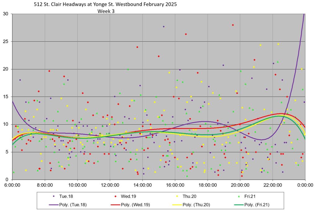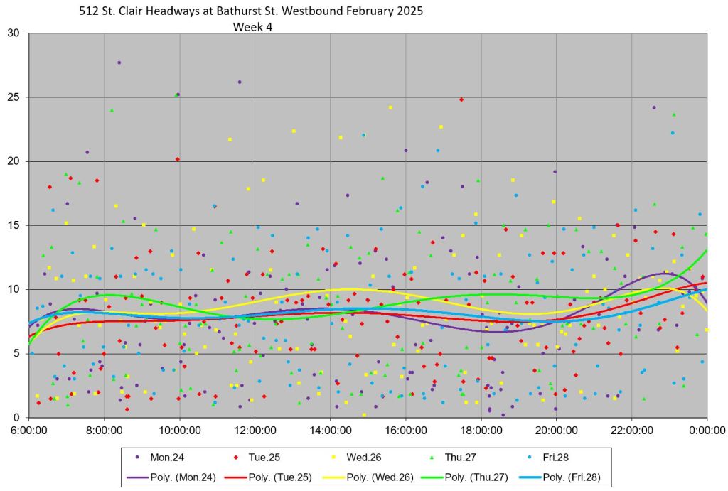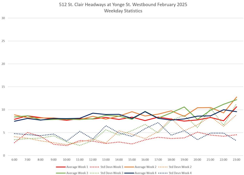 These charts show headways crossing a screenline in the middle of Yonge Street. Departures from St. Clair Station will be slightly earlier, but the scatter in values cannot be explained by traffic interference in the short distance from the station exit to Yonge.