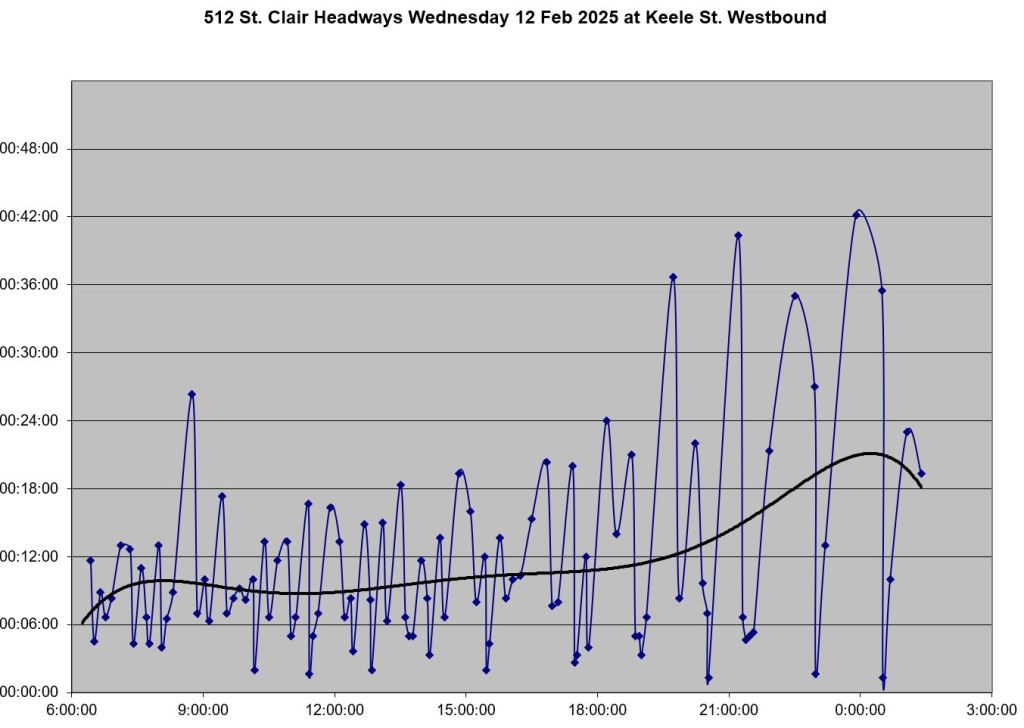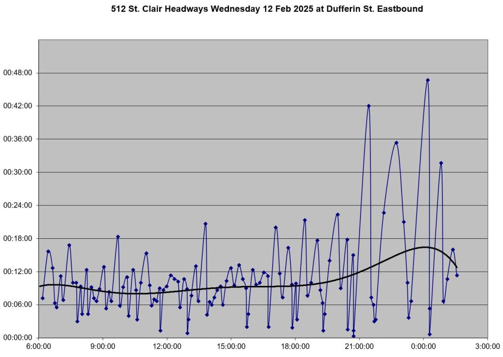 Was hoping I’d see data for February 12, as I have text message correspondence from that evening with a friend when I waited at least 30 or 40 minutes in windy, blowing snow for an eastbound streetcar at Keele and St. Clair. Eventually 4 showed up in a row, but if transit data was to believed there was a long stretch around 8:30pm where not a single streetcar was pointing eastbound along the entire route.