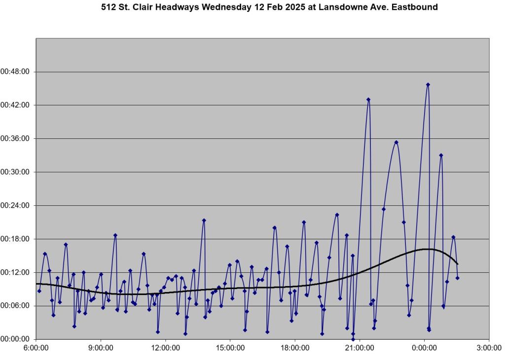 Steve: I have added the chart for February 12. It’s not pretty, but what is striking is that the very poor evening service is largely down to poor spacing of cars, not delays enroute.