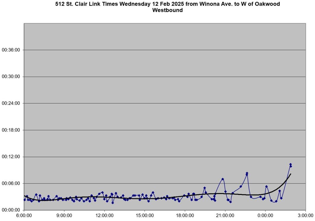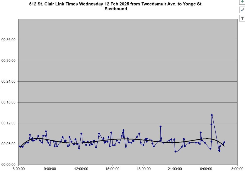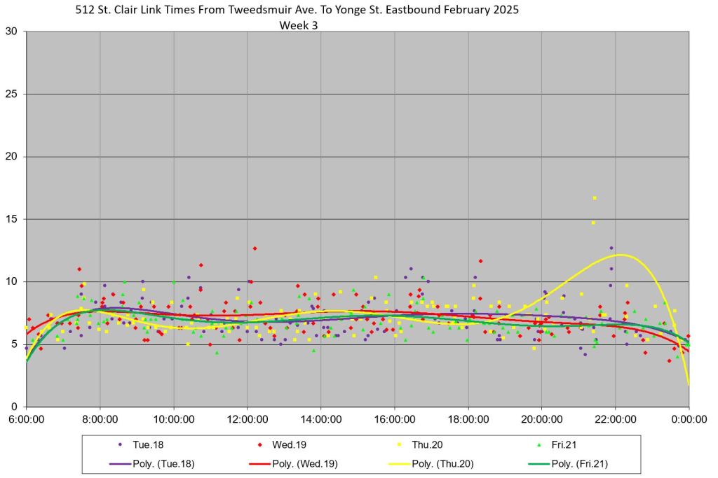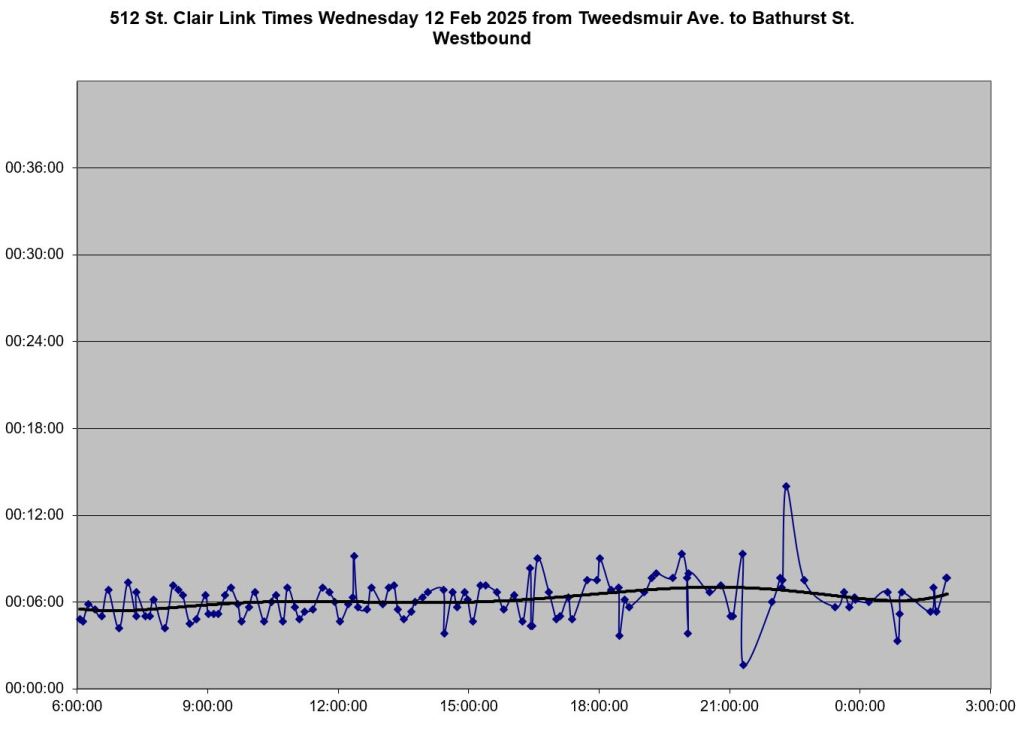 The ride in the trend line for Thursday, February 20 in the evening eastbound was caused by a parade of cars arriving at Yonge Street. Two of them queued west of Yonge Street adding to the reported travel time to reach the screenline at the intersection.