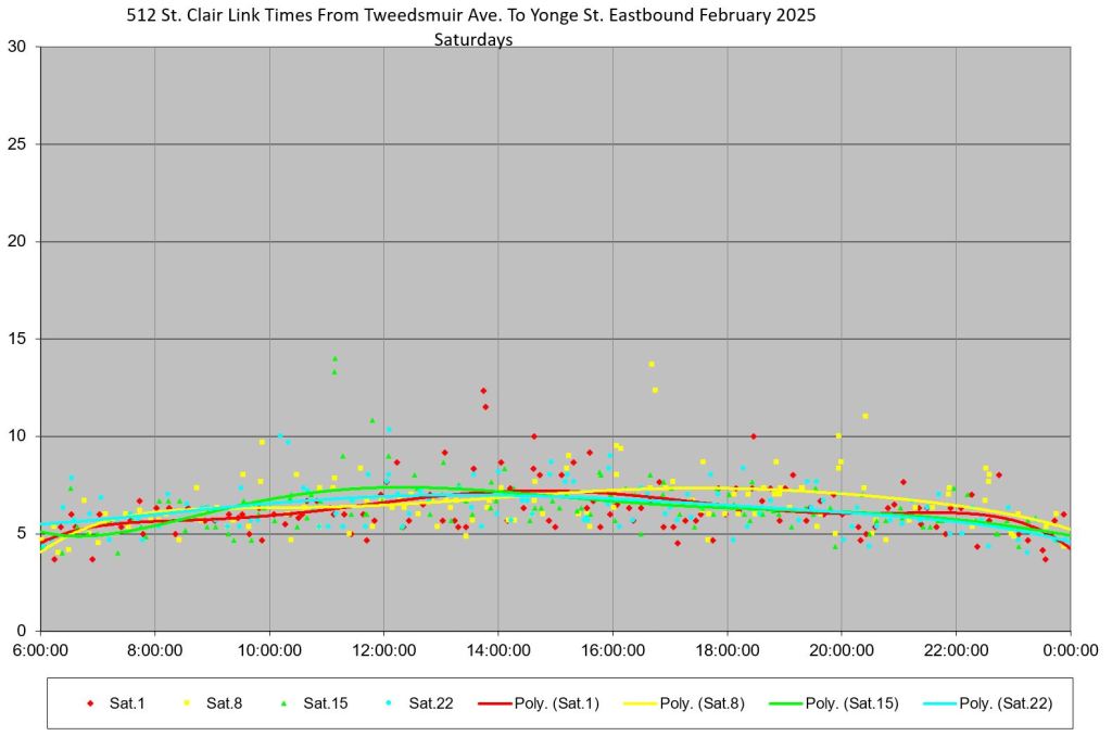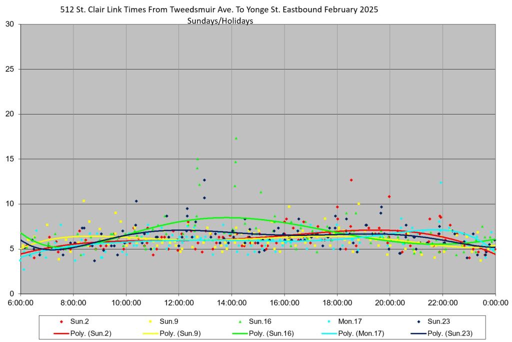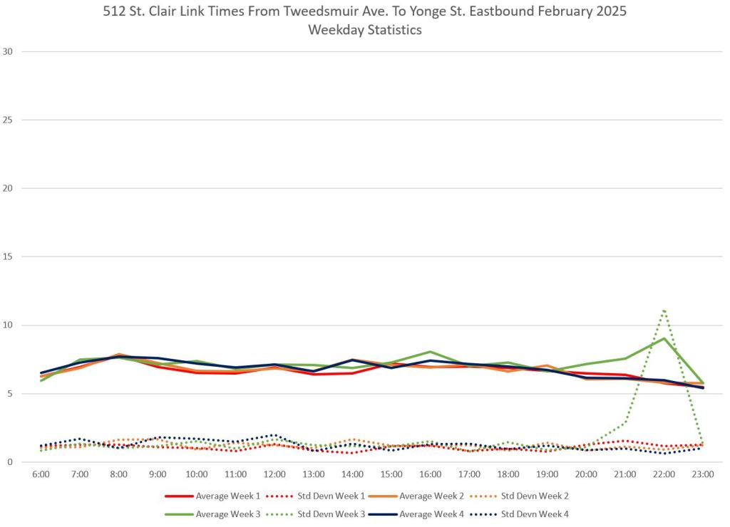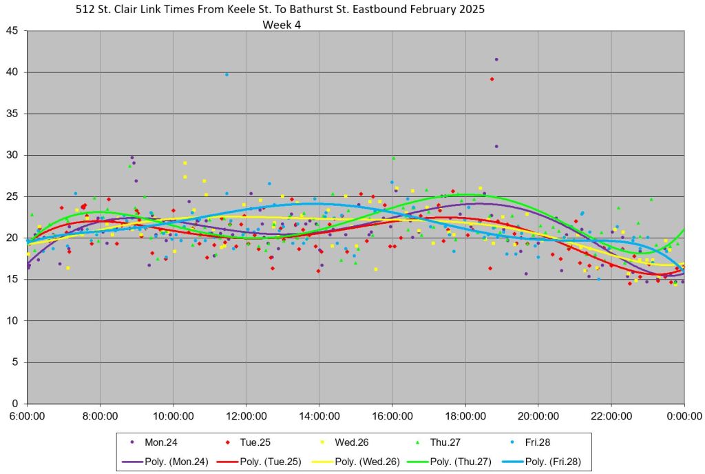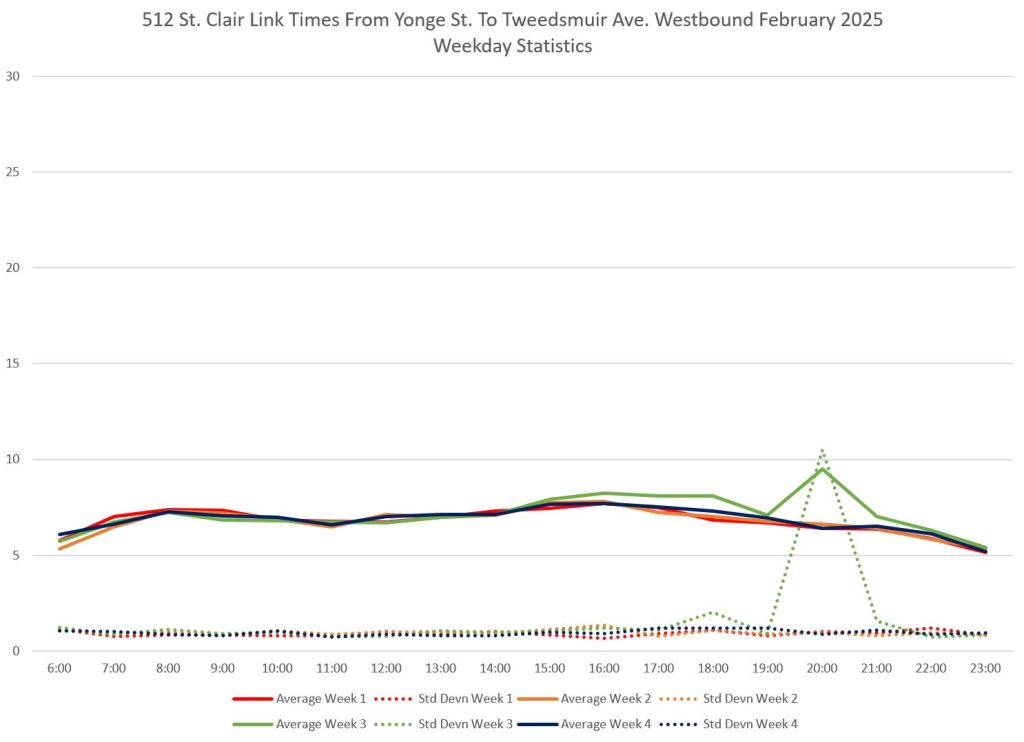 The charts below show travel times by segment eastbound from Keele Street to Bathurst Street in February 2025.