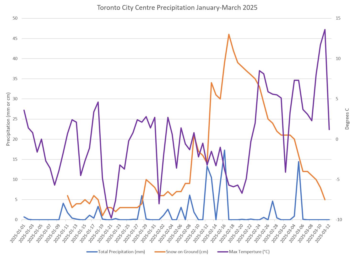 The chart below shows the amount of precipitation (blue), accumulated snow on the ground (orange) and daily maximum temperature (purple) for January through early March when with warmer weather the snow finally disappeared.