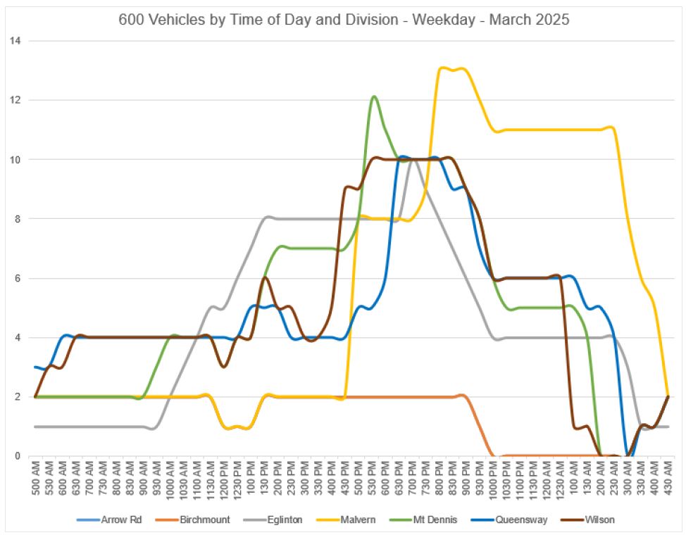 Route 600 buses are dispatched from various divisions for use as extra service where required. The number of these vehicles has declined gradually with a transition to assigning vehicles to specific routes.