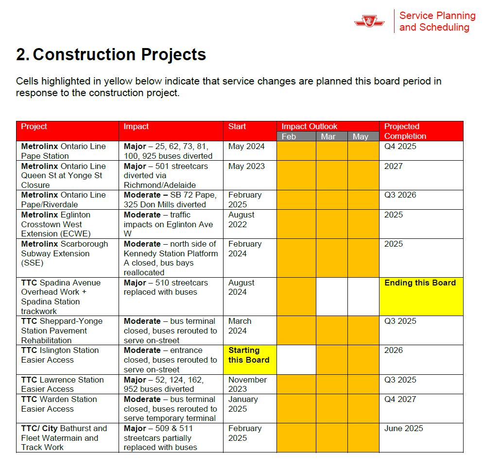 Hey Steve, wondering if you know, or more likely are able to find out, what the service impacts will be to service when the Spadina Platform Extension work resumes? I noticed that the contract is to be awarded in Q3 2025 according to the most recent Major Projects Update