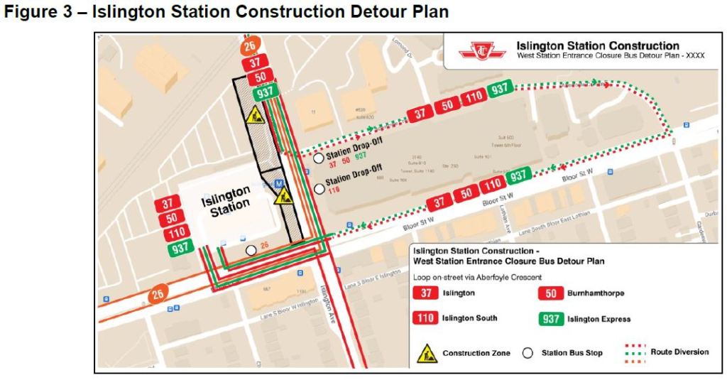Easier Access construction at Islington Station will close the western entrance to the station. Buses will divert via Aberfoyle Crescent and Bloor Street with on-street drop offs near the eastern station entrance. Southbound 37/937 Islington and 50 Burnhamthorpe buses will stop on Aberfoyle east of Islington. Northbound 110 Islington South buses will stop on Islington according to the map below, but the detailed route description shows them using the stop on Aberfoyle.