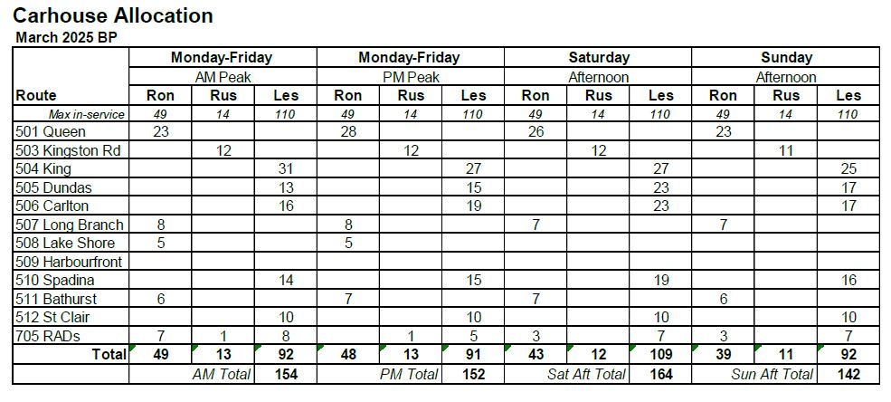 Something about those RAD streetcars doesn’t quite add-up: 8 RAD’s operating from Leslie from 2 AM until noon plus four RAD cars running in the AM peak only gives a total of 12 RAD cars from Leslie out in the AM peak hours – yet the vehicle allocation table shows 8 RAD cars out in service from Leslie at the time.