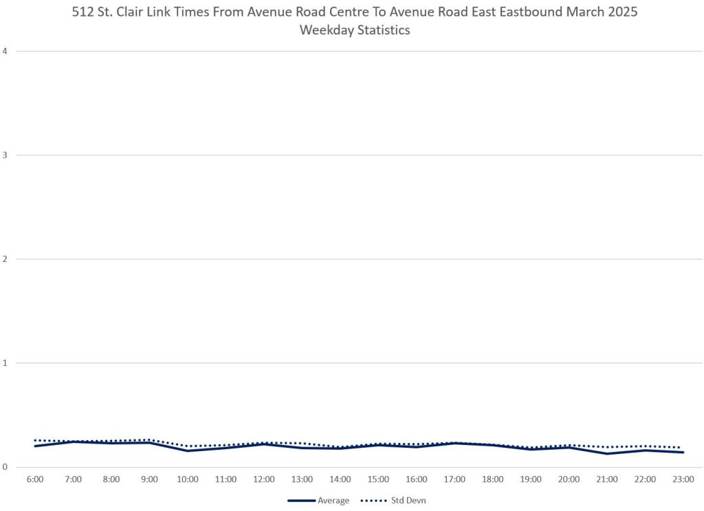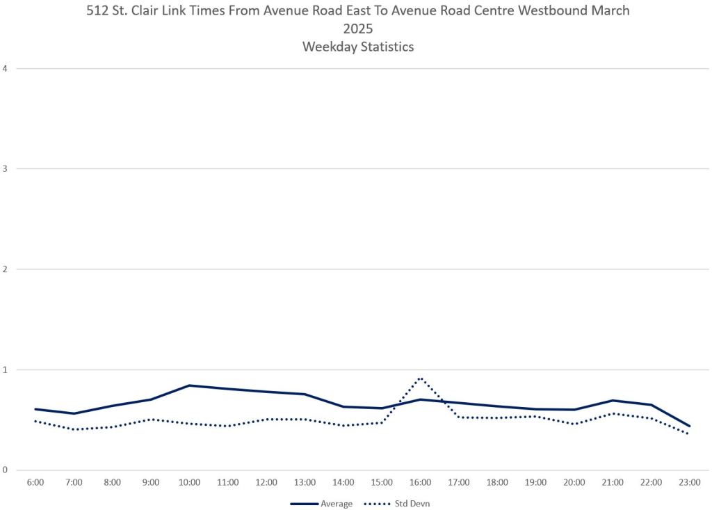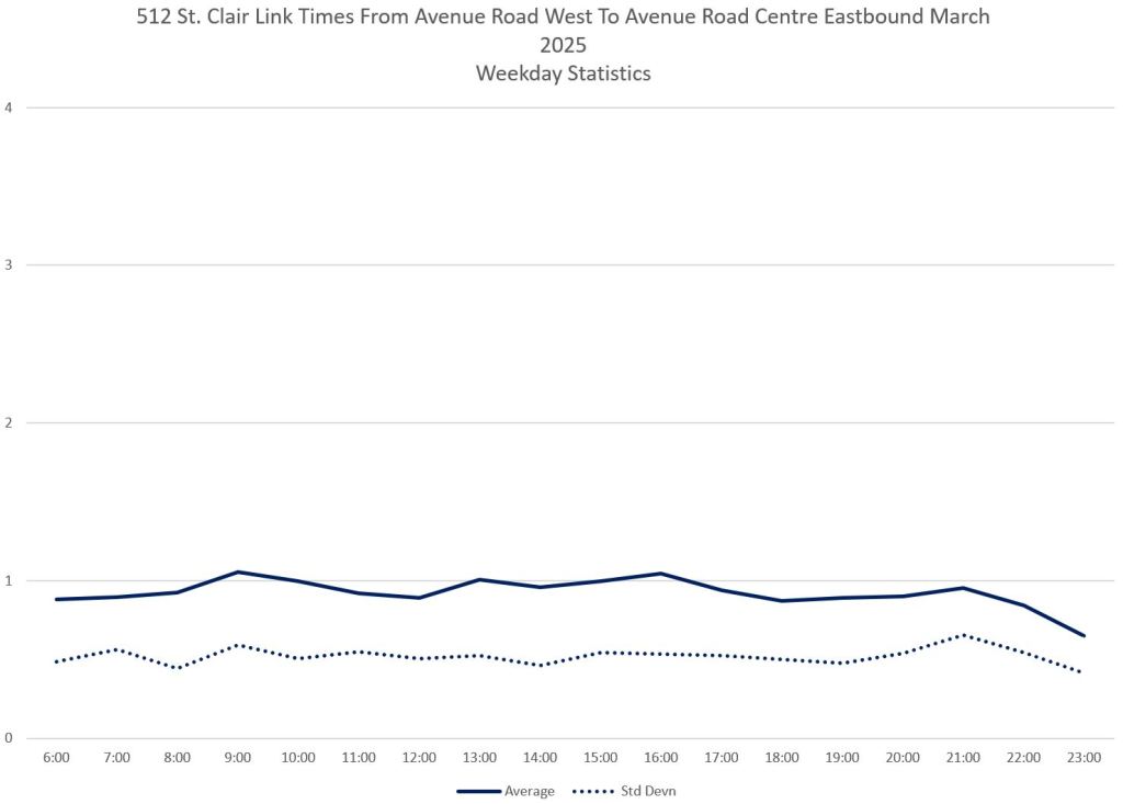 Travel times on the approach (east) are clearly higher than on the departure side of Avenue Road even though the latter includes the actual stop.
