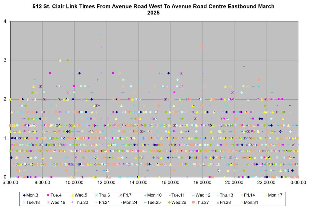 Eastbound approach times at Avenue Road are scattered over a wide range, even worse than westbound data shown earlier.
