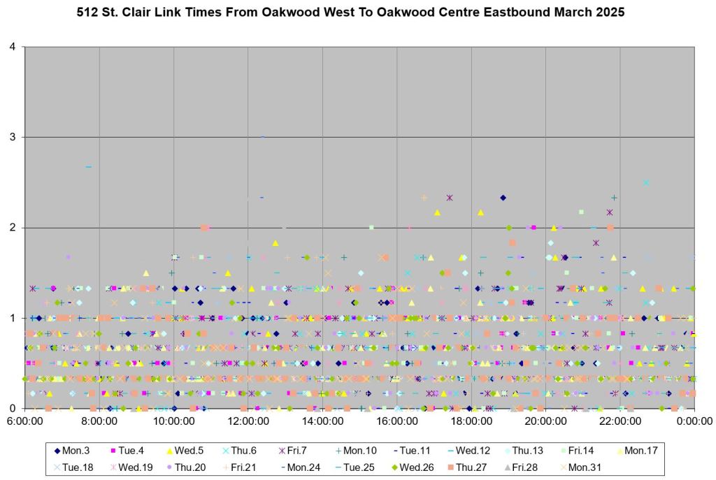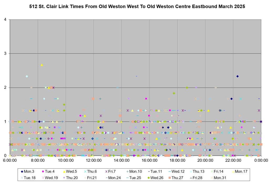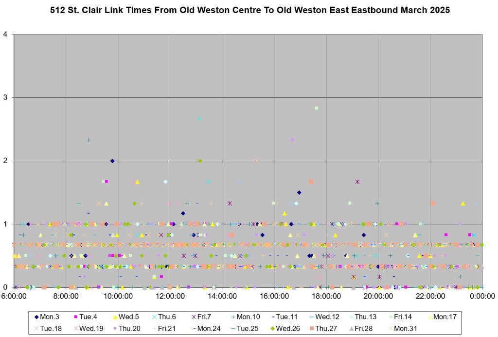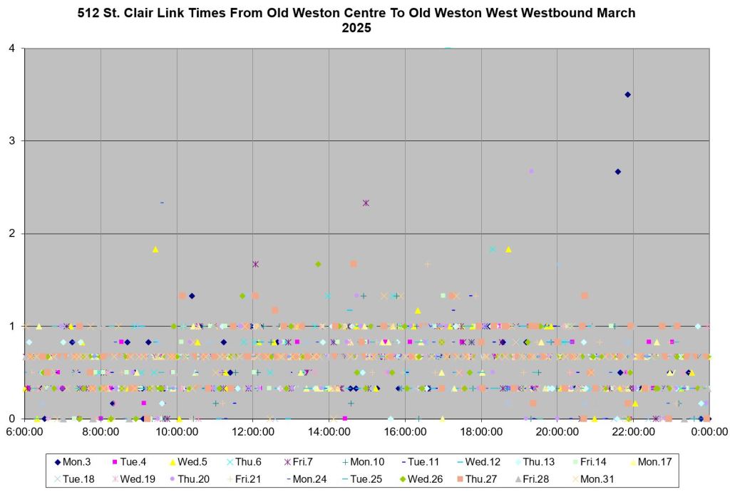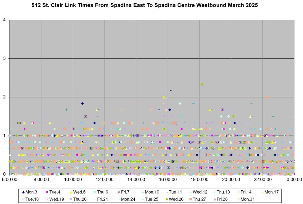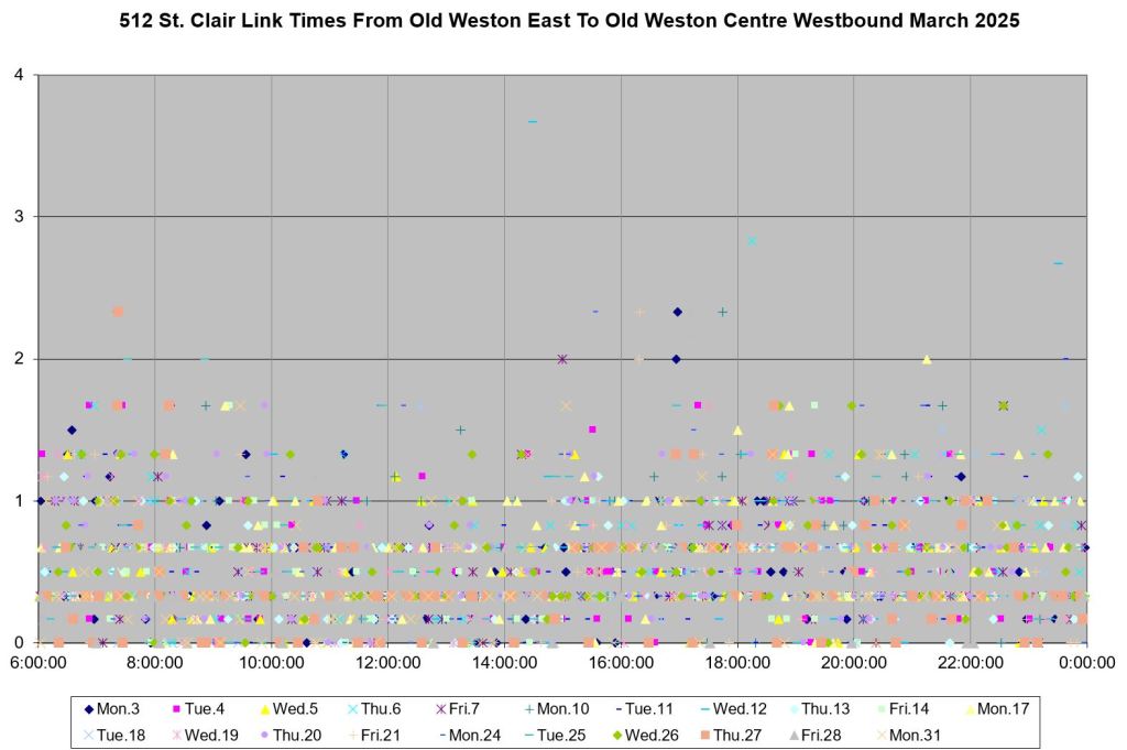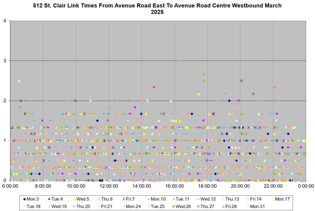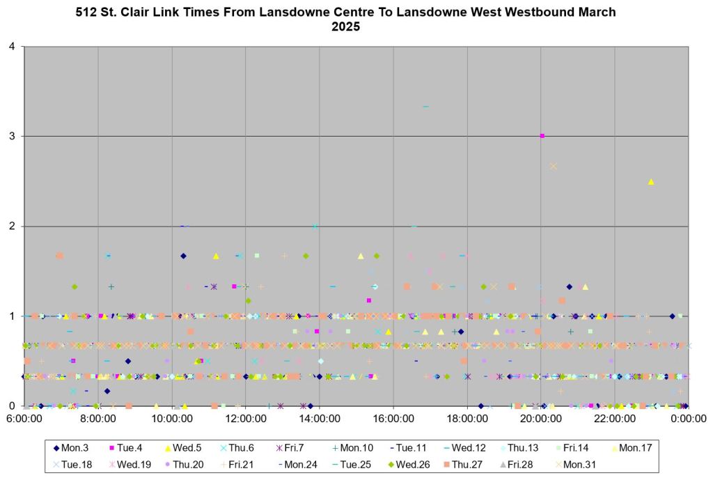 The scatter in east side times at Lansdowne is higher than on the west side although the average times ar lower. This can occur due to streetcars waiting to make left turns south on Lansdowne to short turn at Earlscourt Loop.