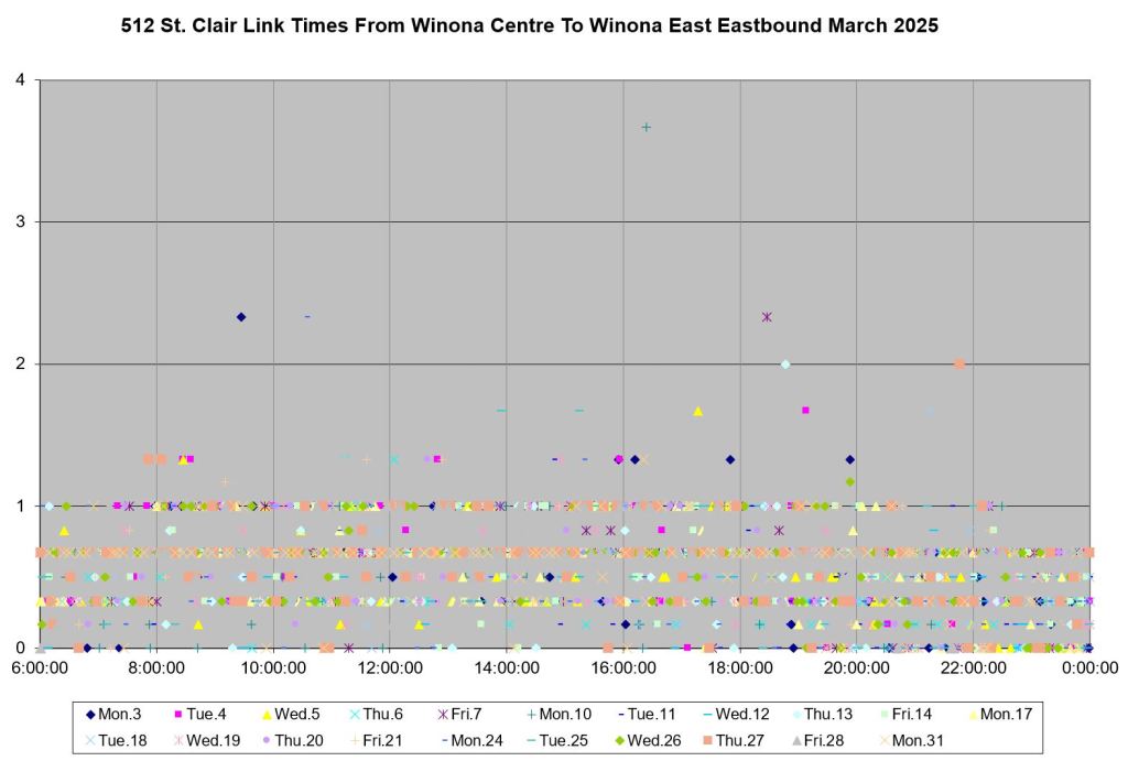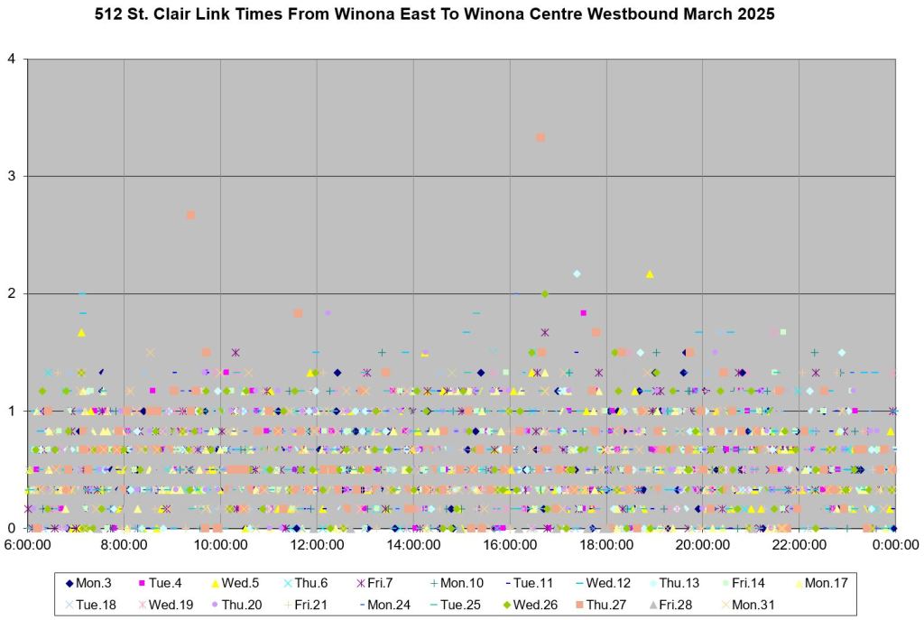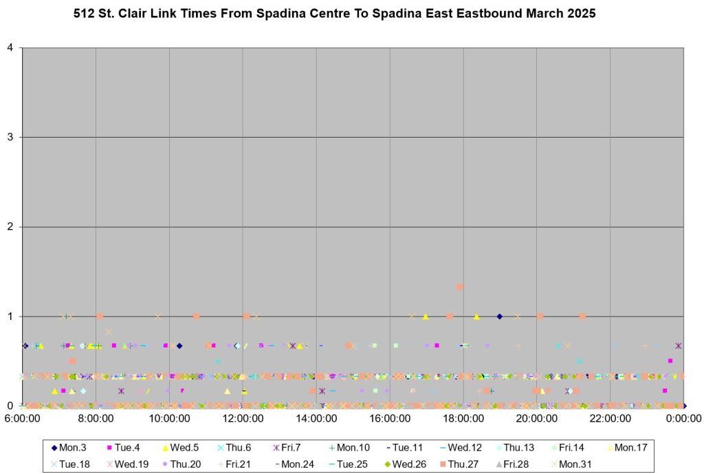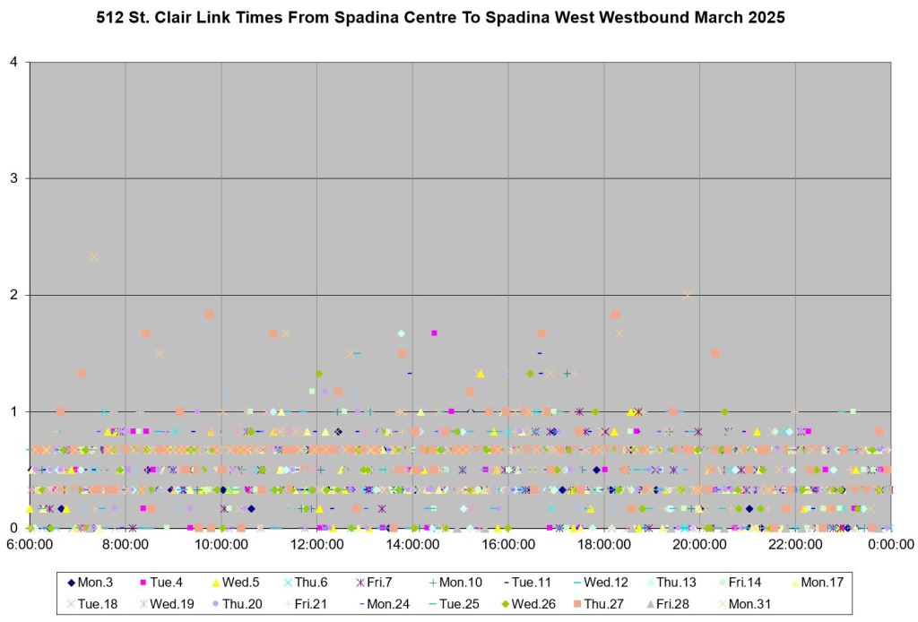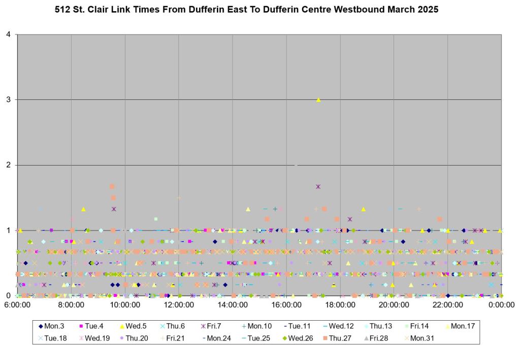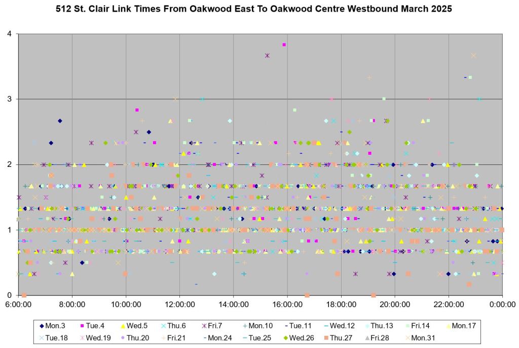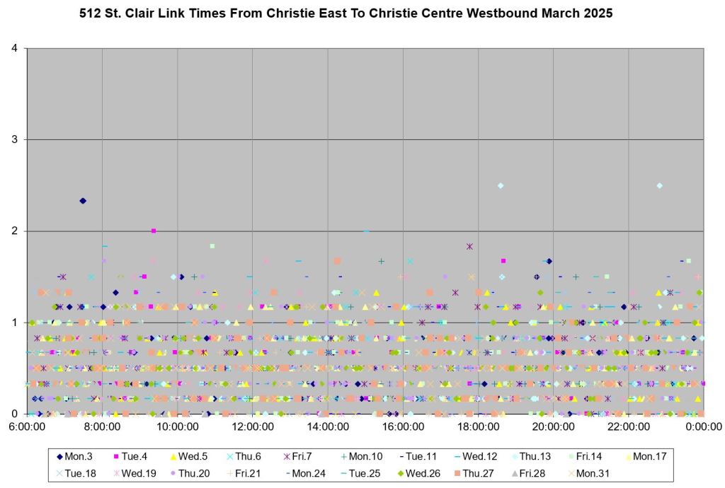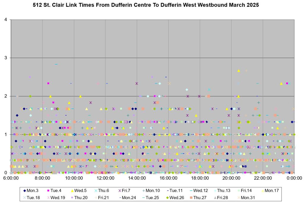 The scatter in east side times at Lansdowne is higher than on the west side although the average times ar lower. This can occur due to streetcars waiting to make left turns south on Lansdowne to short turn at Earlscourt Loop.
