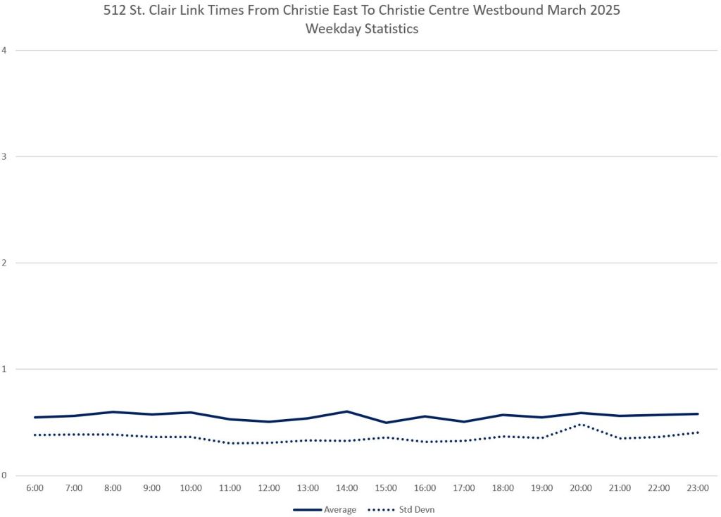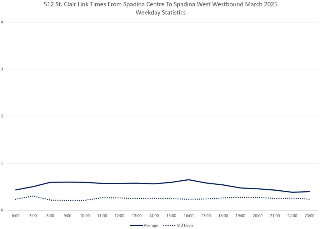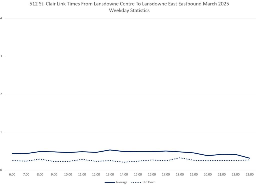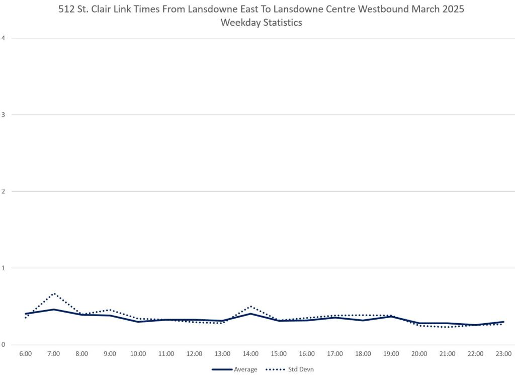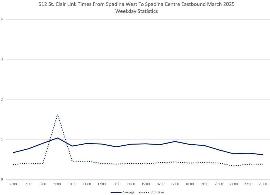 The standard deviation spike at 11am on the west side of the intersection was caused by a delay near Oakwood that held service both ways on March 28. There is a corresponding spike eastbound at Dufferin.