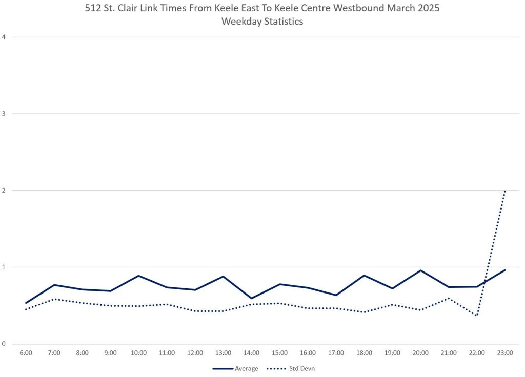 The stop at Keele eastbound is nearside, and so the stop service time is part of the western approach to the intersection. On the east side, the times are very low.
