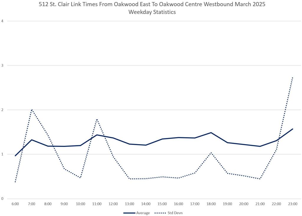 The stop at Oakwood westbound is nearside, and so travel times here include stop service times. There were also a few delays that skewed the standard deviation values on the east side.