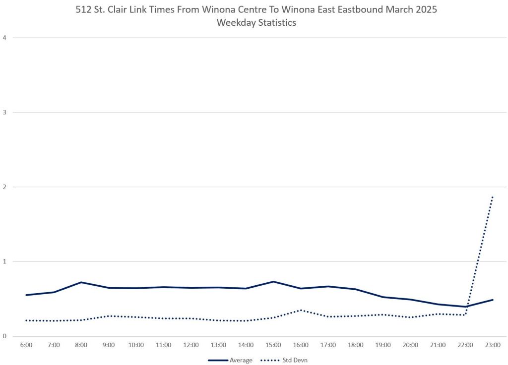 Travel times on the east and west side of Winona are not as markedly different as at some other locations, but there are still more scattered values (higher standard deviation values) on the approach (east).