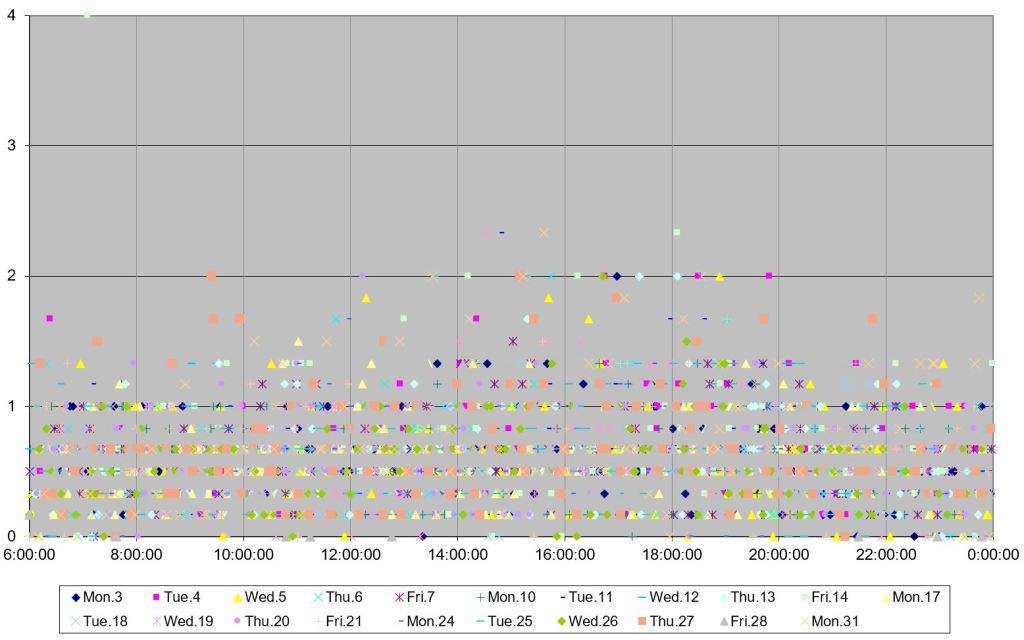 The spikes in the standard deviation values were cause by a delay where one car held at the stop (west side) and its follower held on the approach (east side). The delay was 11 minutes long and so the data point does not appear on the charts.