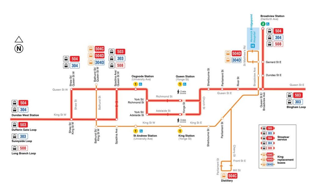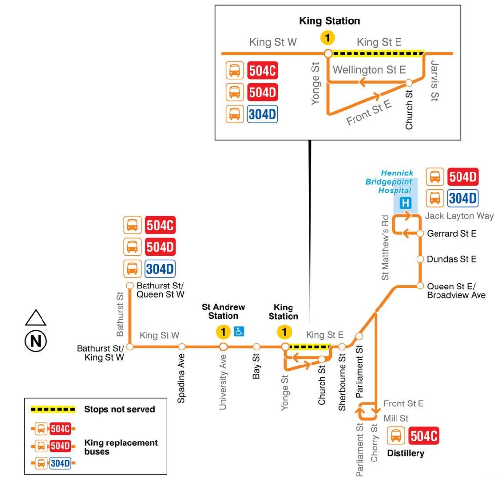 Effective Monday, June 2, 2025, the 504C/D and 304D shuttle buses will divert around the construction at King & Church via Yonge, Front/Wellington and Jarvis as shown in the map below. This affects only the shuttle buses, and the streetcar diversions via Richmond/Adelaide are not affected.
